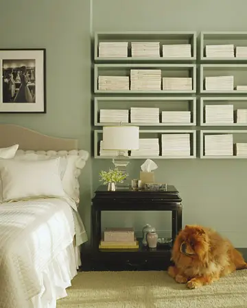 Покрашенные в нежный зеленый цвет стены спальни украсят книжные полки похожего цвета. Если это кабинет – сделайте на полках цветовой акцент, покрасив их в яркий цвет.