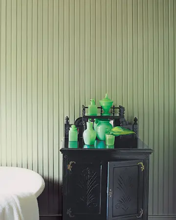 Интересной идеей будет использование темно – коричневой или черной краски для мебели. Тогда зеленые стеклянные предметы подарят вам свое неповторимое опаловое мерцание.