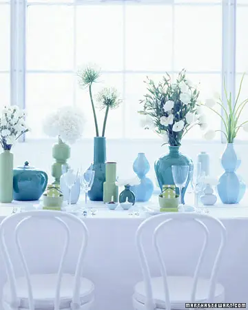 Ощущение фешенебельности и элегантности создаст оформление столовой в бледных холодных тонах: бледно – голубого для мебели, скатерти и декоративных подушек, нежно – зеленого для столовых приборов и натуральных цветов в заданной гамме (белых гвоздик, гортензий, хризантем, тюльпанов). Яркие вазы на столе создадут необходимый акцент.