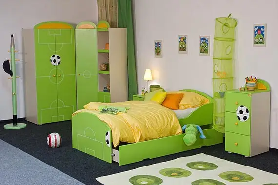 Чтобы комната вашего ребенка заиграла пестрыми футбольными красками, положите на пол декоративный коврик в виде футбольного поля. Закажите шкаф, тумбочки или кровать зеленого цвета с футбольной разметкой и изображениями мяча.