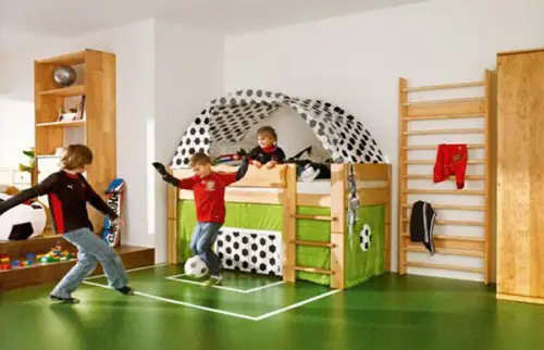 Вы можете подобрать оригинальную мебель для вашего маленького футболиста. Например, кровать-чердак в виде футбольных ворот. Спальное место такой кровати расположено вверху, а внизу изображены футбольные ворота. Ребенок может играть с друзьями и отрабатывать удары по мячу, не выходя из дома. Правда лучше будет, если этот мяч — подушка. Либо же в комнате не должно быть бьющихся вещей.