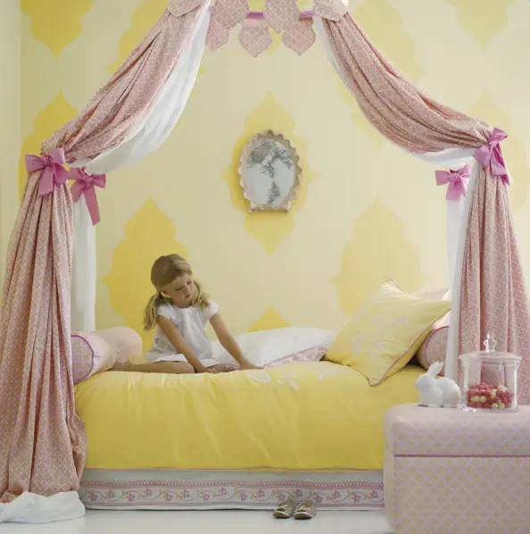 Также, дети будут в восторге, если вы им сделаете шалаш или повесите балдахин над кроватью. Такой декор детской комнаты можно посмотреть на фото внизу.