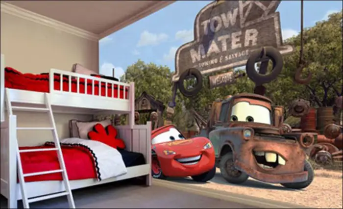 На стенах и мебели вы можете наклеить декоративные наклейки для детской комнаты. Например, персонажи из любимых мультиков, забавные зверюшки, деревья и цветочки, буквы или цифры будут радовать вашего ребенка, и развивать его творческое мышление. Самым легким вариантом будет поклеить в детской комнате фотообои с изображением героев мультфильмов, например, «Тачки» как на фото.