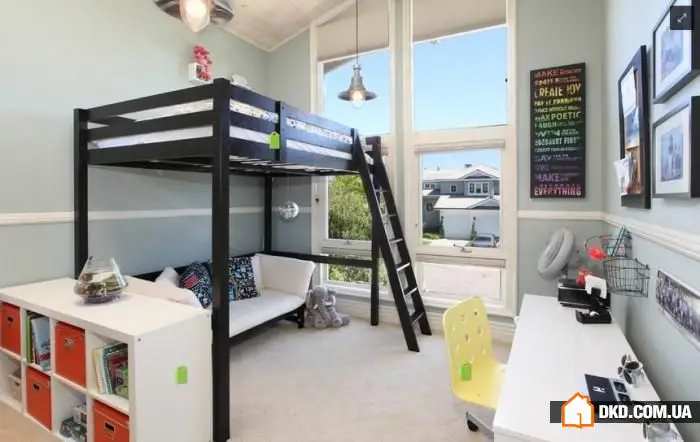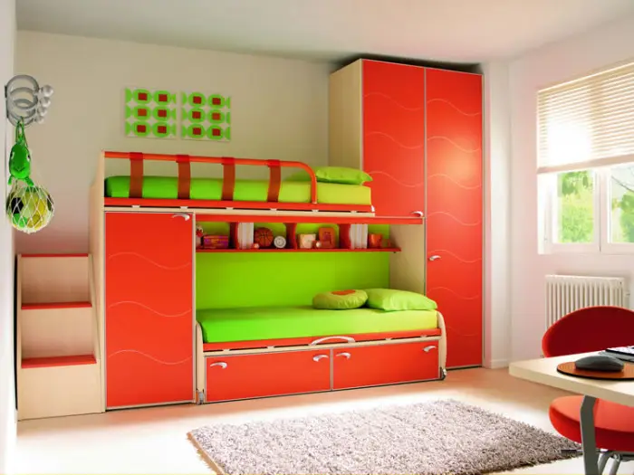 Обстановка детской комнаты должна начинаться с выбора мебели. Во-первых, это кровать. Если детей двое, то можно приобрести двухъярусную кровать. Такие кровати обычно многофункциональны. Они бывают выдвижными, с лестничками, тумбочками, горками, похожими на палатки, с зоной для игр или учебы. Вы можете посмотреть подборку фото с такими кроватями.