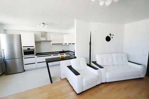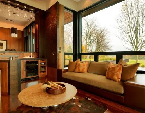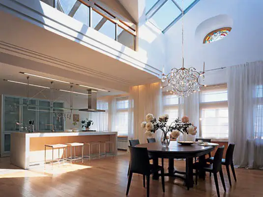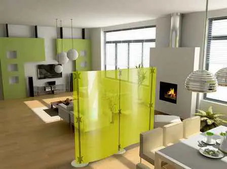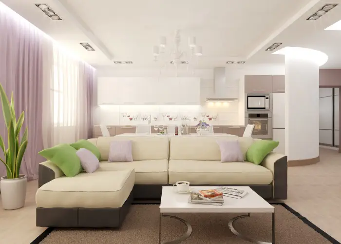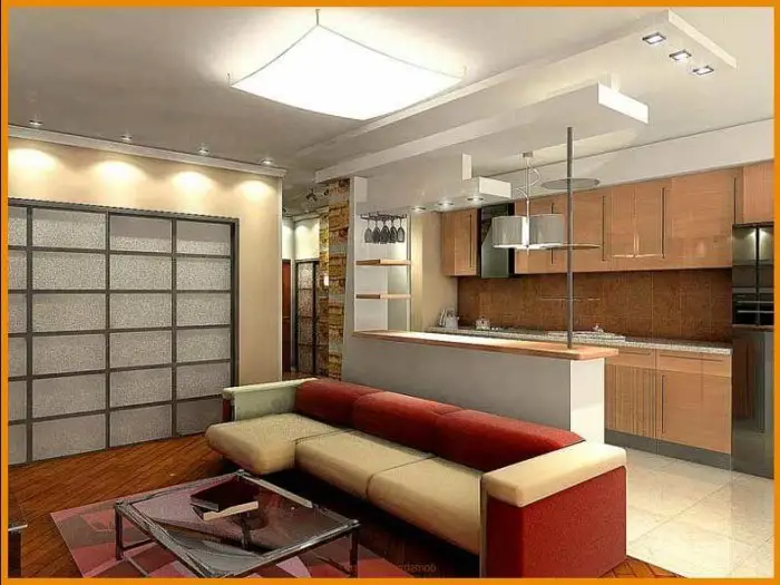 Разделять зону кухни и зону гостиной можно не только условно, но и фактически. Если кухня-гостиная была организована путем перепланировки (снесения стены между этими двумя помещениями), разделить их можно перегородкой из гипсокартона или с помощью раздвижных дверей. Впрочем, возможности гипсокартона позволяют сегодня возводить легкие стены и там, где их изначально даже не было предусмотрено.