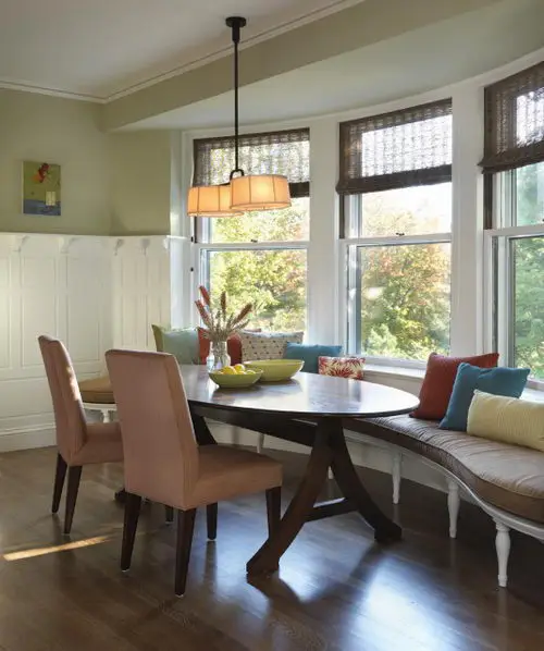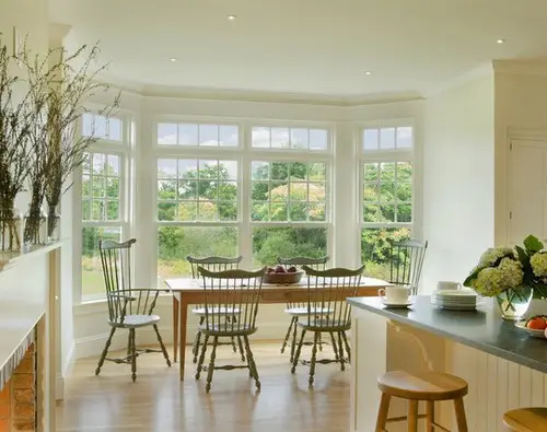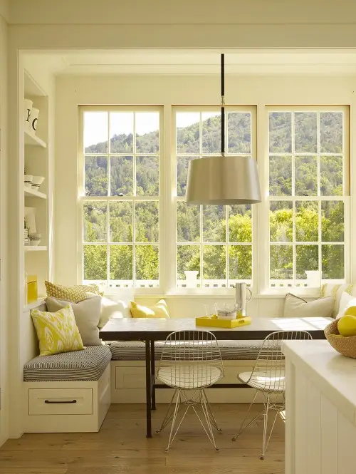 Или, если позволяют размеры, обустроить столовую или зону отдыха, как на фото ниже. Хозяйкам на заметку: несколько окон на таком небольшом участке создают эффект близости с природой, а, как вы помните, на природе аппетит всегда улучшается. Поэтому есть шанс, что дети все же будут доедать свой завтрак.