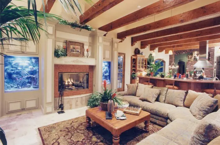 Ничто так не греет душу, как тихо потрескивающий камин, особенно, если за окном лунная ночь или зимняя вьюга. Кстати, камин тоже может помочь отделить кухню от гостиной. Даже если вы житель городской квартиры – не беда. Современная индустрия предлагает в продаже электрокамины, практически не уступающие в эстетике и функционале настоящим.