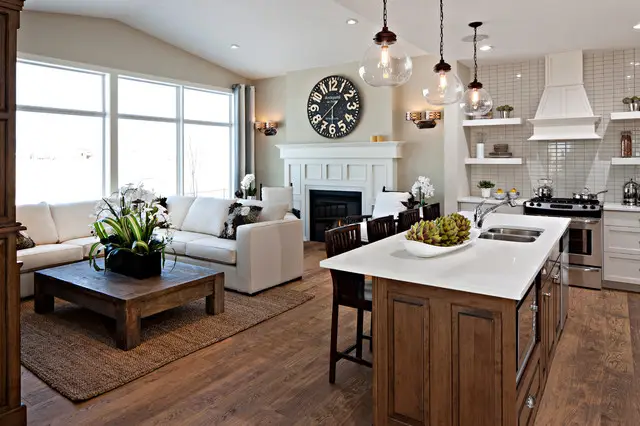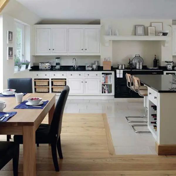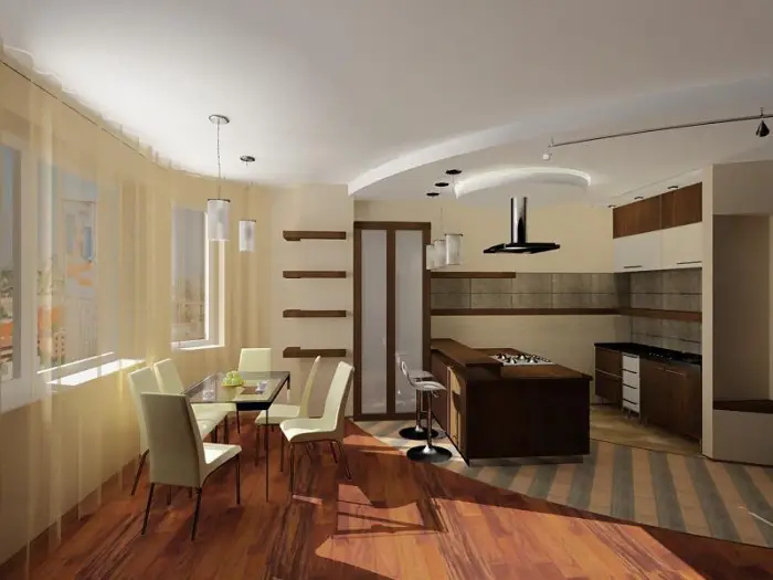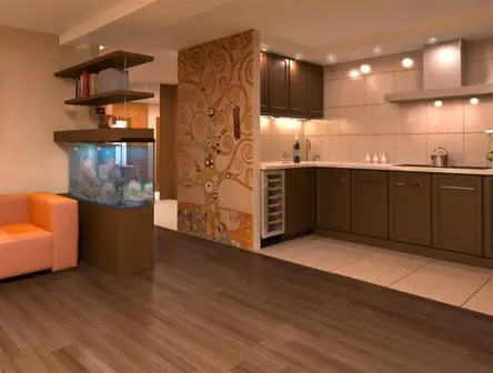 Также вариантом зонирования может стать разноуровневый пол и комбинирование напольного покрытия. Таким образом, вы зрительно отделите зону кухни от зоны гостиной без использования перегородок.