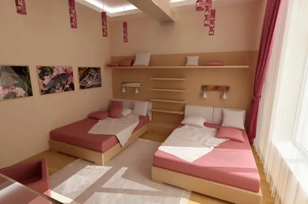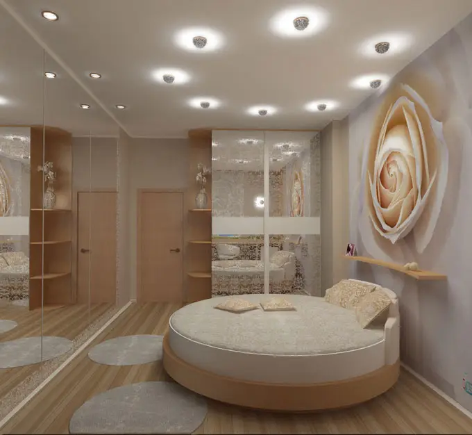 Такой вариант вполне мог быть создать по фен-шуй: комната не имеет окон, но в ней очень много зеркал для визуального расширения (или как говорят специалисты этой практики – «лечения») пространства. Искусственный свет подчёркнуто расположен над кроватью «даёт понять» энергии Ци, какой предмет в комнате является центральным. А присутствие большого цветка на стене вместе с растительной фактурой тканей указывает на то, что это место, где ожидается рост и цветение.