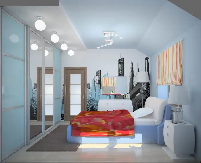 Фото 12 — Все неправильности форм потолка спальной комнаты задействованы, и не возникает ощущения ущербности пространства