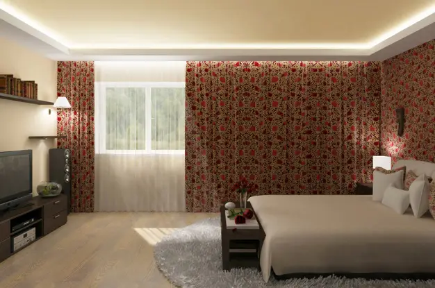 Совершенно недорогой вариант оформления спальной комнаты представляет оформление пола, стен и кровати в одних тонах плюс обильное использование тканей для штор и одной из стен.