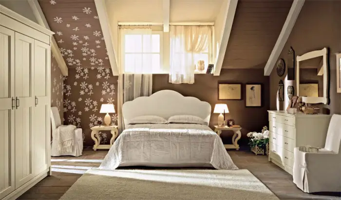 Спальню можно устроить и на чердаке. В такой спальне наверняка будут сниться самые интересные сны. Мансардная спальня на даче, дизайн которой уже сам по себе необычен из-за скошенного потолка и нестандартного размещения окон, особенно уютна в молочном или жемчужном цвете. Чем более природная отделка спальни на чердаке, тем лучше: натуральное дерево, лоза и другие материалы в мебели и декоре.
