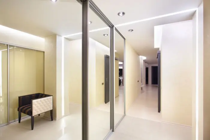 Некоторые горе-дизайнеры советуют в панельных домах для зрительного расширения пространства использовать зеркальные поверхности. Да, зеркала во многом помогают в данном вопросе, однако не следует крепить зеркальные панели на стены таких прихожих: эффекта от такого хода практически не будет. Раз уж на то пошло, зеркальными панелями лучше украсить потолок прихожей.