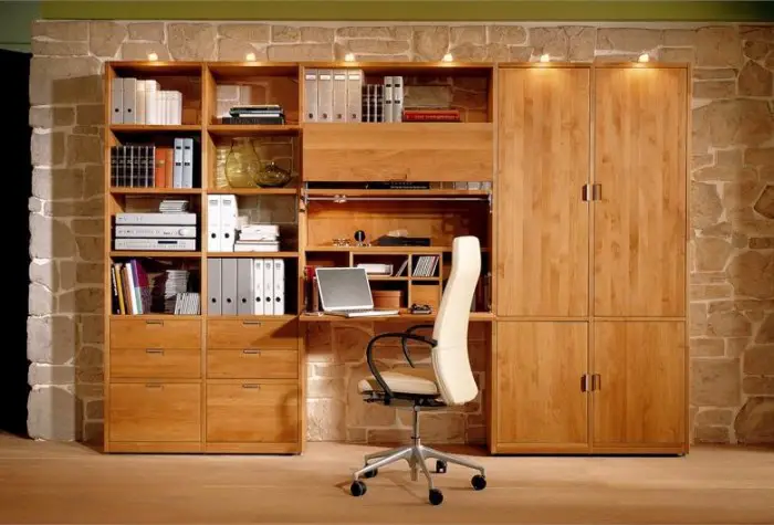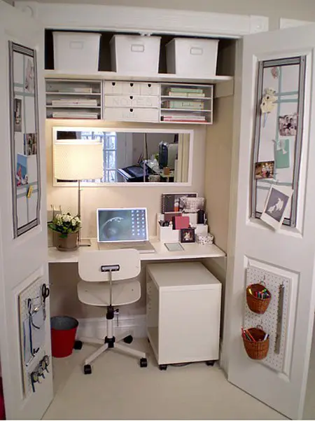 Если рабочее место располагается в шкафу-купе, позаботьтесь о дополнительном точечном освещении. Более оригинальный, переносной вариант − USB-лампа или же стильный светильник на аккумуляторных батарейках.