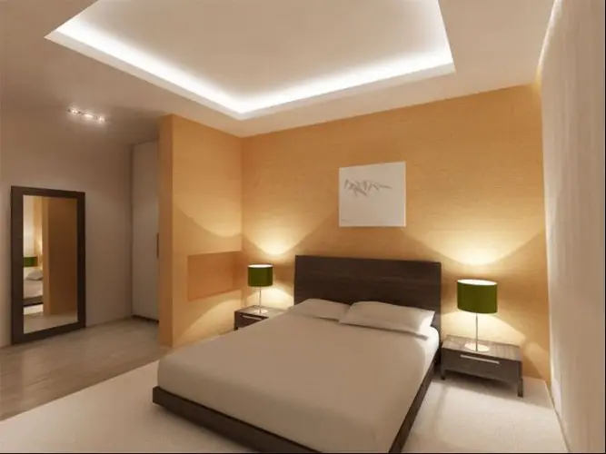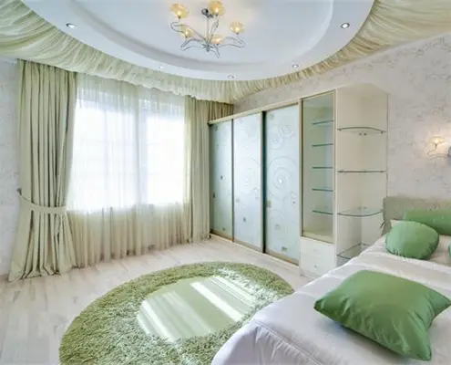 Неровные стыки плит и «волнообразные» углы прекрасно скроет и гипсокартон. Потолок из гипсокартона может быть многоуровневым. Как правило, создается 2-3 уровня, обрамляемых и выделяемых подсветкой. Один из наиболее популярных ходов – создание многоуровневой конструкции потолка прямо над кроватью. Кроме этого можно драпировать потолок тканями.