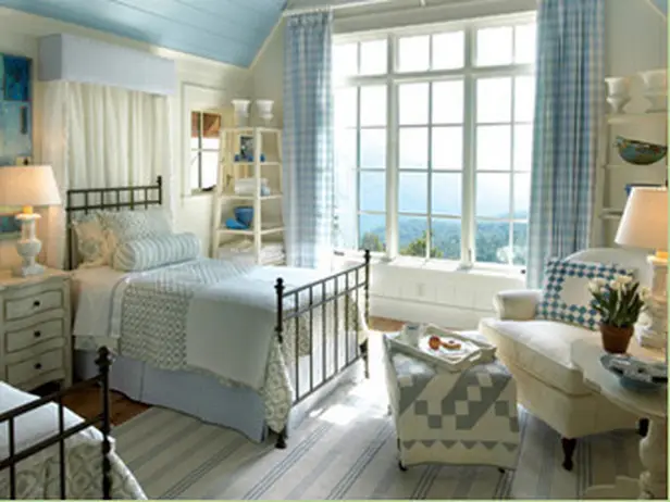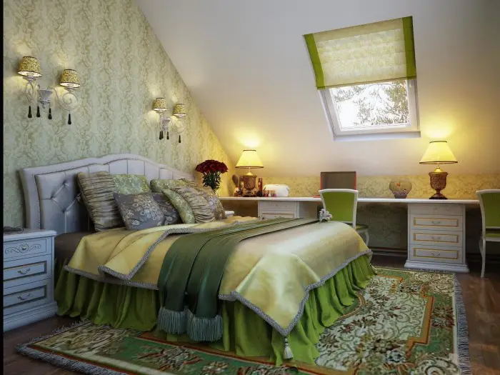 В спальнях, размещенных на мансардах, потолки имеют необычное устройство: они состоят из нескольких плоскостей, находящихся под разным углом к стенам. В наклонной части потолка могут быть окна. Так как форма скошенного потолка оригинальна уже сама по себе, то лучше всего потолок мансарты окрашивать в один тон или оклеивать однотонными обоями пастельных тонов. Белый и молочный цвета наиболее подходят для спальни-мансарты.