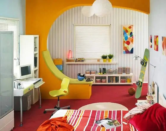 Проводя разделение детской комнаты, зону отдыха сделайте в спокойных бежевых или зеленых тонах, а игровую в ярких синих или красных тонах. Одну из зон можно сделать на подиуме, так разграничение будет более явным. Ниже представлены фото, на которых деление сделано стильно и с умом: