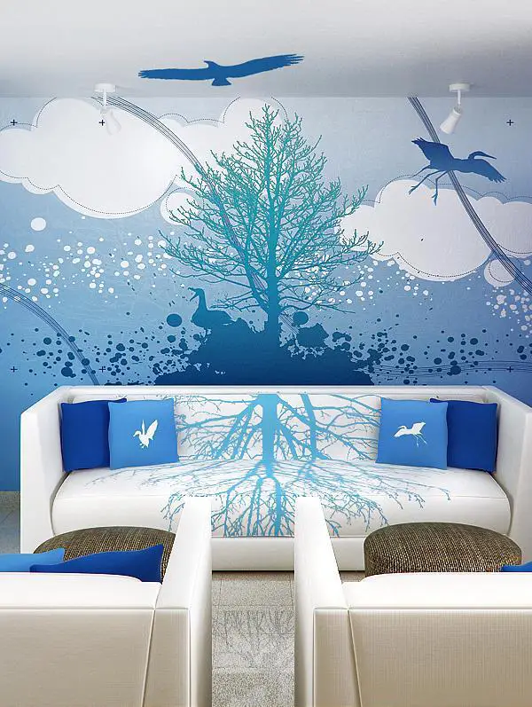 Легко заменить окно можно с помощью фотообоев на всю стену. А дополнительный эффект дает потолок, выполненный в светлой гамме, а лучше — в виде светлого неба с белыми облаками.