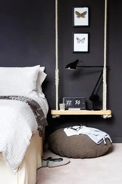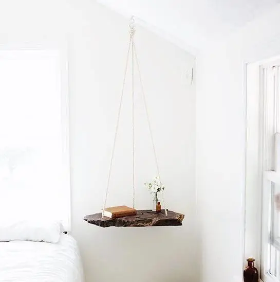 Неординарным может быть не только сам ночной столик, но и способ, при помощи которого он установлен. Подвешенный к потолку столик только на первый взгляд подходит исключительно романтическим особам - канатная веревка с затейливыми узлами добавит ему нужный градус мужественности. Создать в спальне парящую библиотеку из любимых романов получится, отказавшись от традиционной тумбочки в пользу стильной настенной полки.