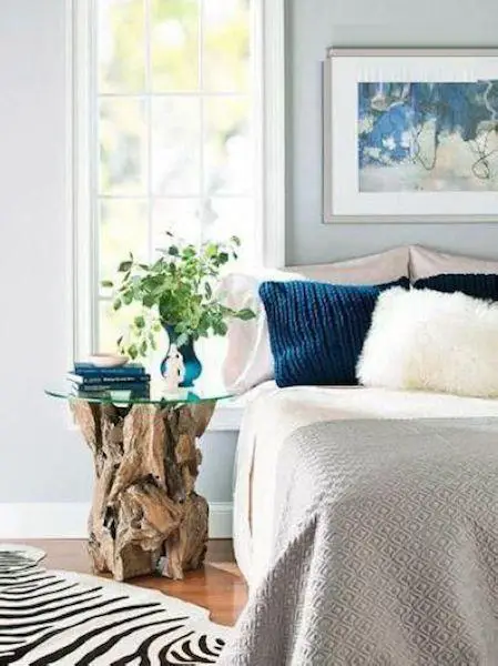 Использование натуральных материалов - эффективный способ создать в спальне непринужденную и уютную атмосферу. Как имитация естественных форм дерева, так и оригинальная конструкция из обработанных досок сделают дизайн комнаты более интересным. Чтобы придать столу более современный вид, можно накрыть его стеклянной поверхностью. Но стоит помнить, что для этой цели подходит только высокопрочное закаленное стекло.