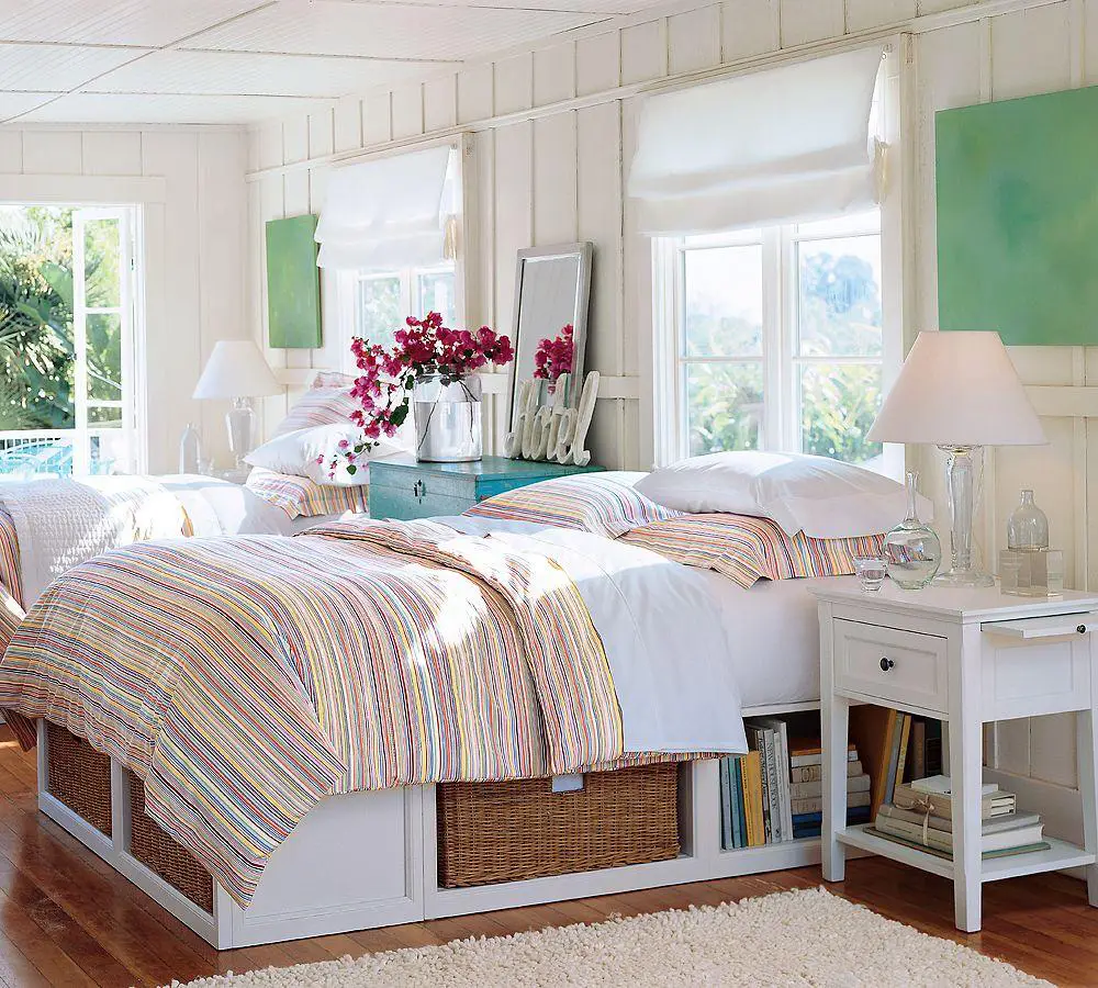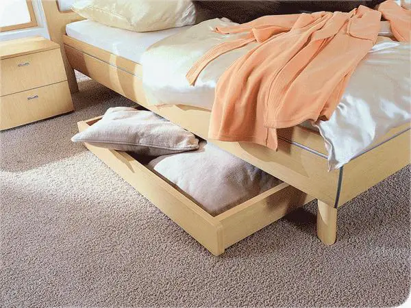 Место под кроватью использовать довольно сложно, поэтому на помощь приходят ящики. Можно подобрать ящики в тон кровати или использовать текстильные из ИКЕА. Ящики отлично подойдут для хранения постельного белья и прочих принадлежностей, сезонной одежды или обуви.