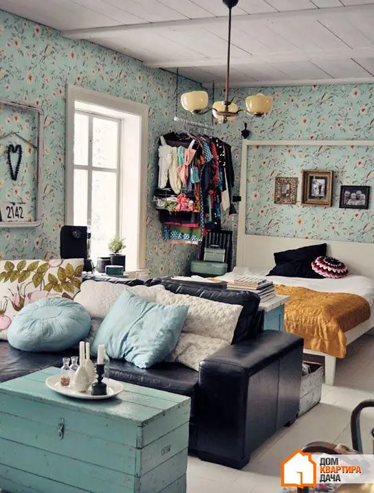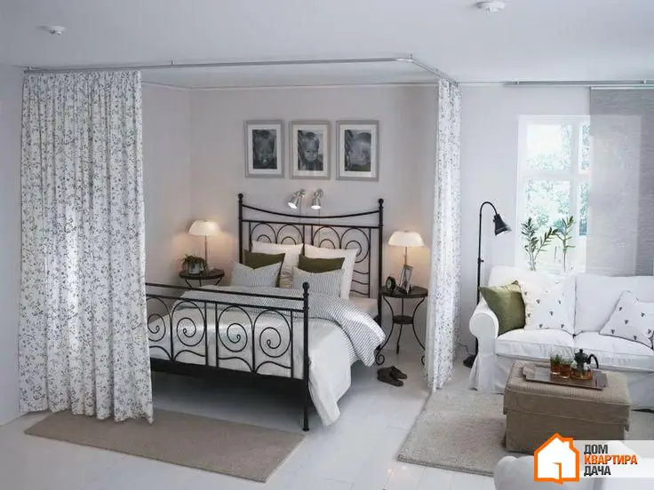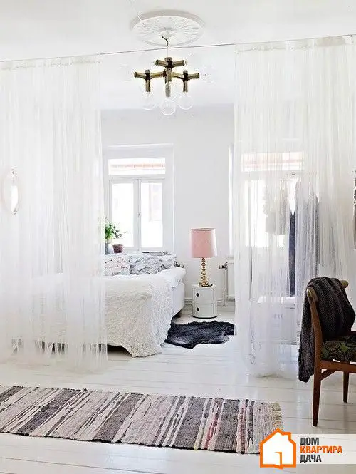 При помощи текстиля можно создать приватное пространство, что особенно актуально для однокомнатных квартир и студий, но пригодится и на большей площади. Ткань-разделитель можно укрепить на балке под потолком, и только от вас зависит, будет ли это прозрачный тюль или более плотная ткань.