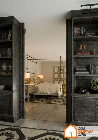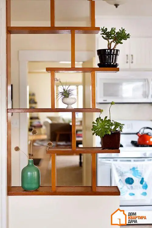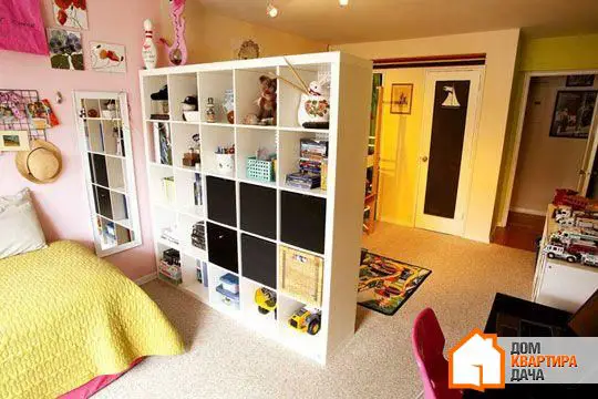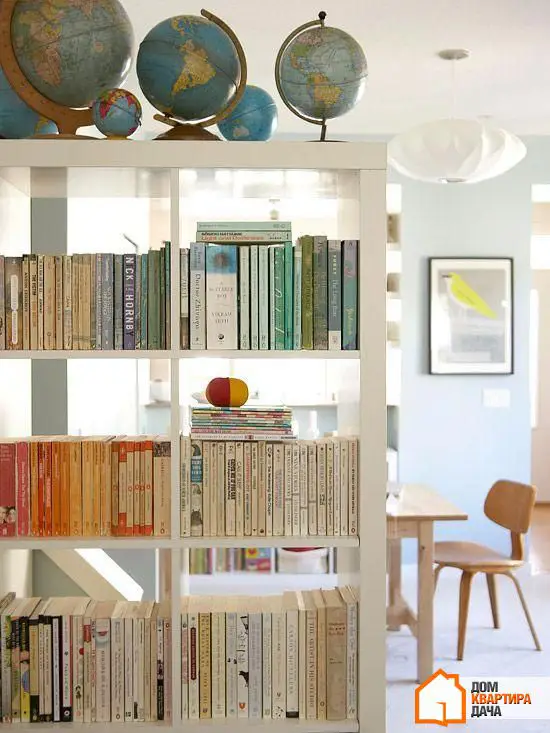Книжный шкаф и полки для декора нужны в любой квартире, но, вместо того чтобы ставить их вдоль стены, устройте перегородку между зонами. Конечно, этот прием выглядит несколько примитивнее, чем работа с цветами или группировкой мебели, зато здесь вы можете быть уверены в успехе: стеллаж — заметный разделитель, однако все же не такой основательный, как стена.
