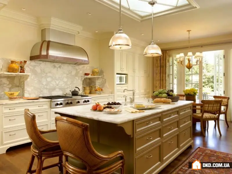 Традиционно отделанная кухня характеризуется большим количеством украшений. Декоративные элементы имеют огромное значение для такого типа кухонь. Варианты же самих декораций поистине бесчисленны и будут уместны повсеместно, также как и элементы лепнины. Перила и филенки являются непременной характеристикой стиля, используемого для классического дизайна кухни. Ручки дверей шкафчиков и выдвижных ящиков также отличаются замысловатыми рисунками и формами. Сами по себе они наиболее часто изготавливаются из латуни, бронзы, олова и хрома с эффектами старины. Если же Вы настроены достичь наиболее эффектного и качественного соответствия, лучше будет обратиться к источникам рисунков и картин этого закаленного прошлым стиля. Мы уверены, что Вас не испугает необходимость индивидуального изготовления большого количества деталей.