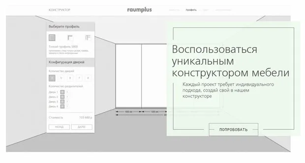 Каждый проект шкафа или гардеробной уникальный и требует индивидуального подхода. Raumplus предлагает создать и рассчитать свое изделие в уникальном онлайн конструкторе мебели.