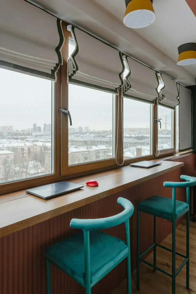 В этой квартире убрали подоконный блок, за счет чего удалось создать широкие проемы с раздвижными перегородками — они ведут на лоджию из кухни и спальни. Лоджию утеплили и сделали на ней место для отдыха и работы — для этого расширили подоконник.