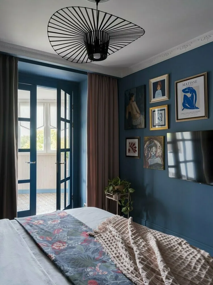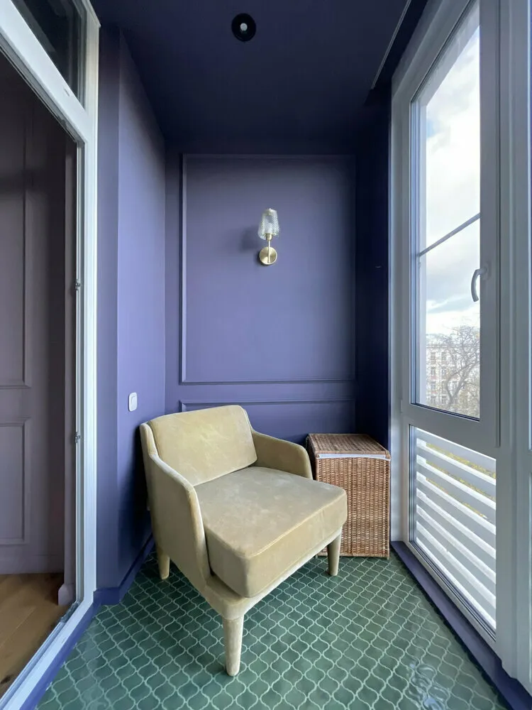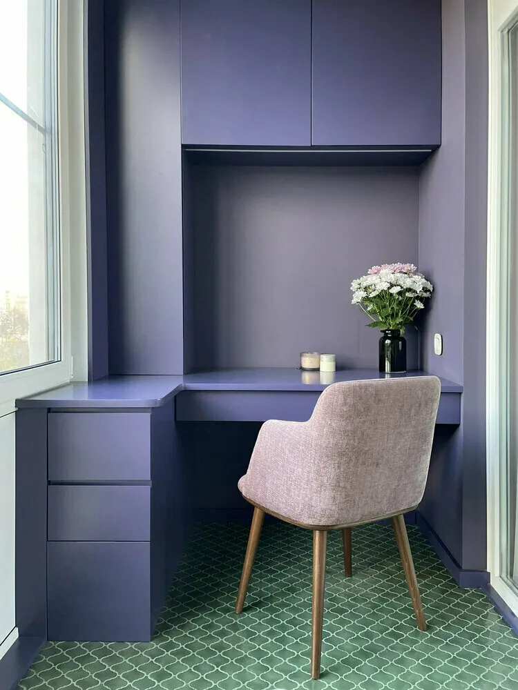 Балкон в этой комнате утеплили и превратили в дополнительную комнату. На полу — зеленая плитка с «теплым полом», а стены и потолок выкрасили в насыщенный синий цвет. Рабочее место получилось максимально вместительным и удобным. В верхней части есть шкафы, а в систему шкафов около окна спрятали коммуникации и коробку вентиляционного блока. Напротив организовали место для чтения — поставили глубокое кресло и предусмотрели бра.