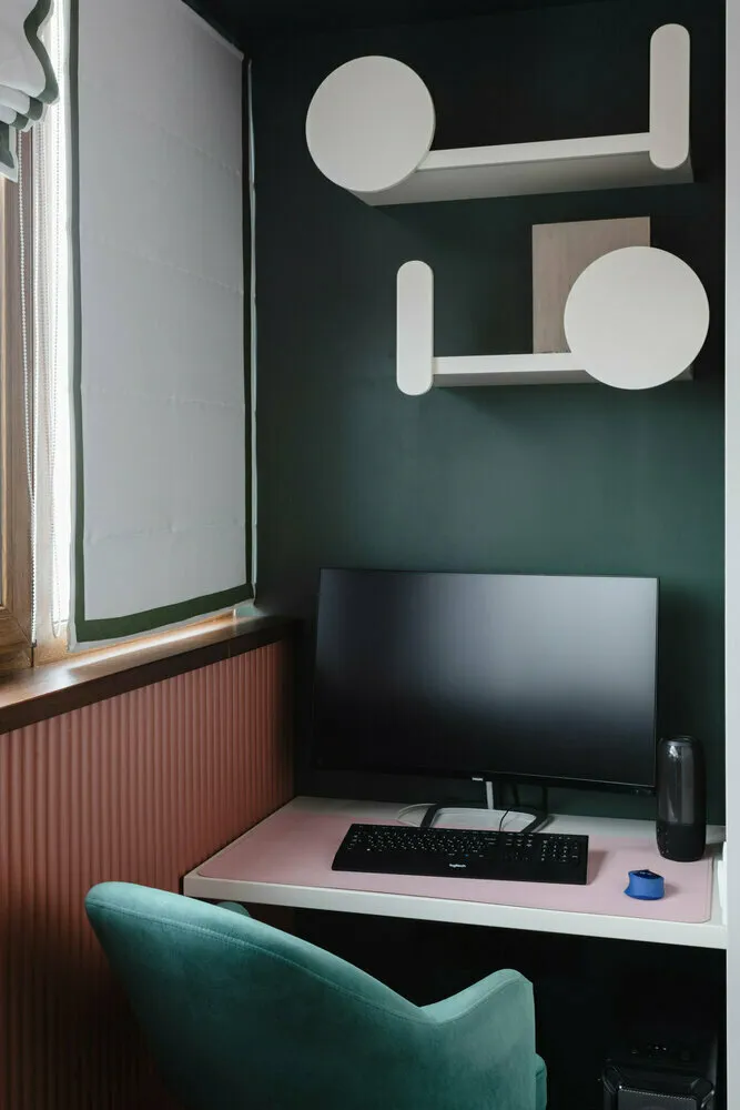 Нижнюю часть стены оформили рельефными панелями, а боковые стены выкрасили в насыщенный темно-зеленый цвет. С одной стороны интегрировали встроенный шкаф для хранения, а с другой организовали рабочий кабинет.