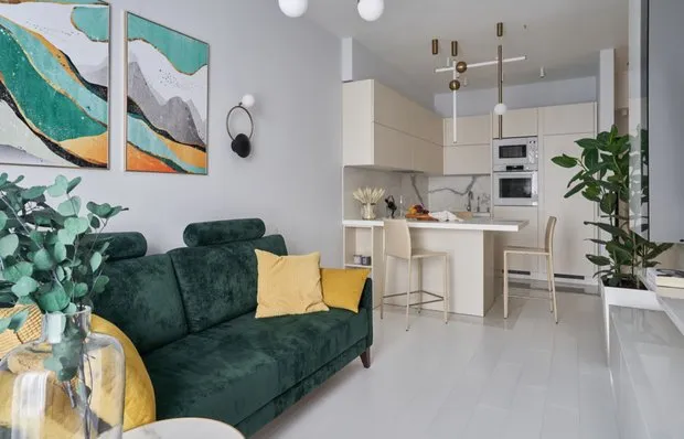 Дизайнеры из студии DSGN HUB создали современное, но в то же время очень уютное пространство для молодой примы-балерины. Гостиную объединили с кухней, при этом рабочую зону сделали максимально эстетичной и парадной.