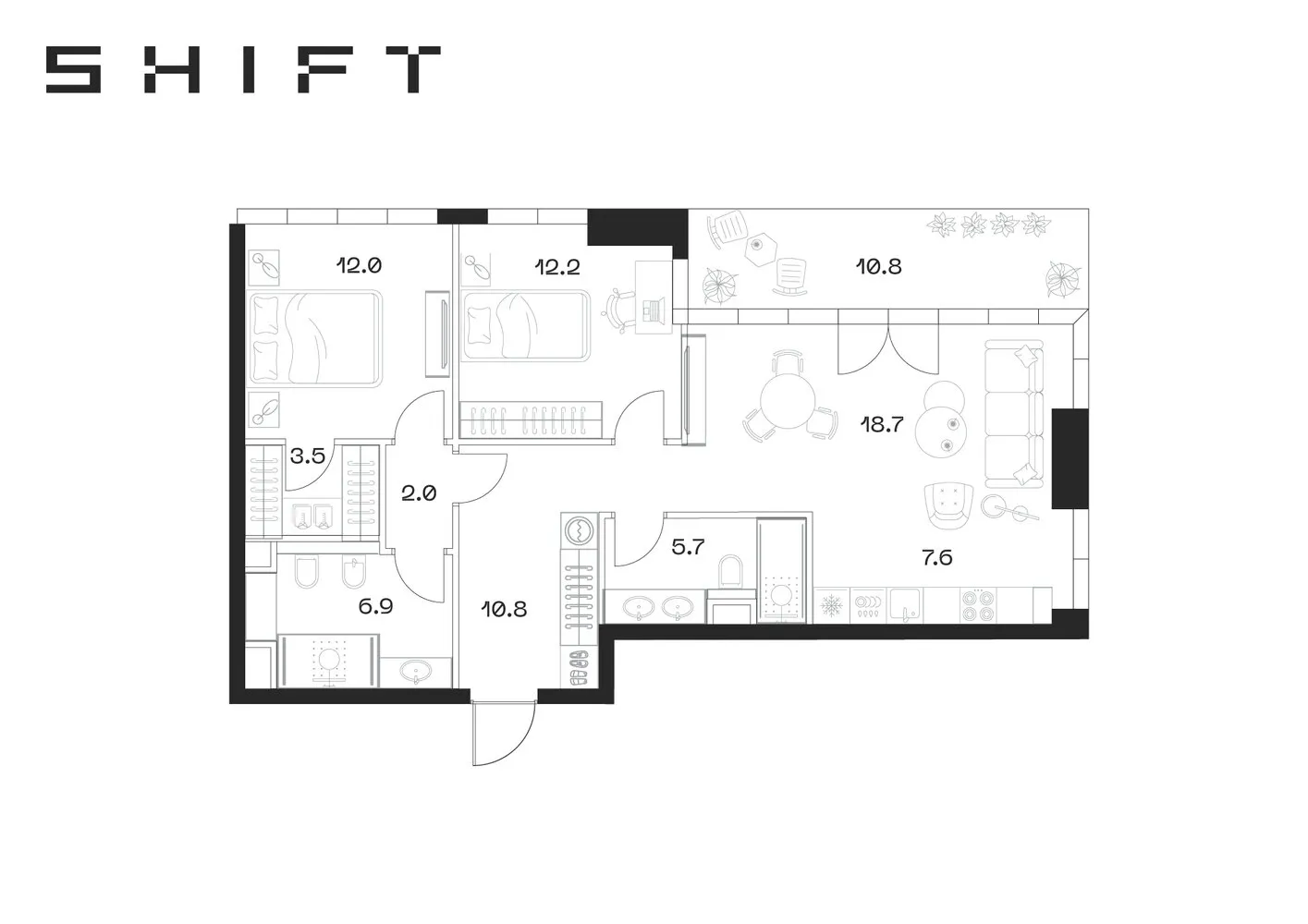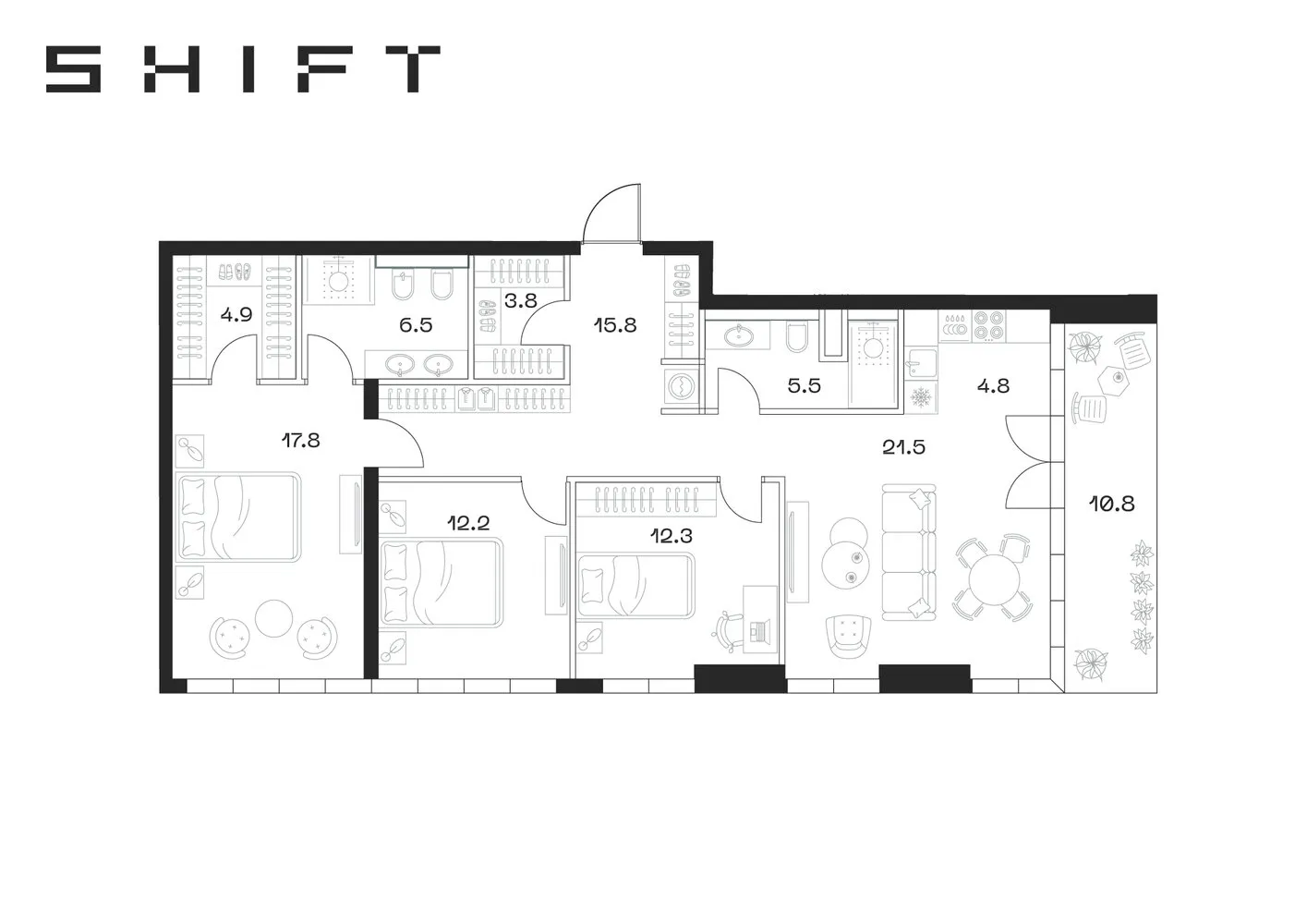 Планировки в SHIFT разработаны с минимальным количеством коридоров, комнатами, наполненными естественным светом, и приватными спальнями, расположенными вдали от лифтов и общих зон, что создает особую атмосферу комфорта.