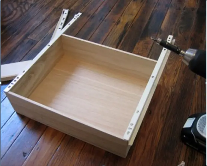 Сперва, сделайте все необходимые замеры, и соберите ящик. Потом, при помощи шуруповерта, прикрепите направляющие. Если есть необходимость – отрежьте лишнее. Потом две направляющие прикрутите на стул, к внутренней стороне.
