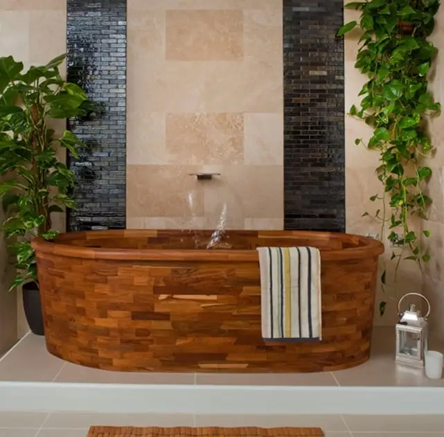 Релаксирование – основная цель создания такого стиля, поэтому остановим свой выбор на дереве. Кроме расслабления, такая ванна поможет избавиться от нарушений сна, болей и тревоги. Есть мнение, что деревянные ванны ускоряют заживление ран.