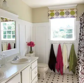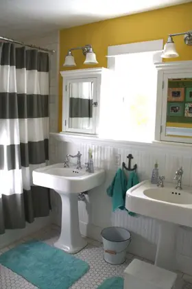 Вам не нужны резиновые коврики и мультяшное мыло, чтобы создать обстановку в ванной, которую будут любить Ваши дети. В простом обновлении достаточно яркой краски и смелых аксессуаров, а несколько размещенных правильно источников света завершит задуманное. Замена белых занавесок для душа на серо-белый шеврон с узором также существенно повлияет на изменение.
