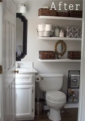 Много мест хранения в ванной комнате, но они все супер устарели? Пора сделать капитальный ремонт ванной комнаты, а именно удалить старый шкаф для хранения выше туалета. На его место, установить несколько белых полок, и наполнить открытыми стеллажи с сочетанием корзины для хранения и аксессуаров для декора. Результатом является стильное и функциональное пространство.
