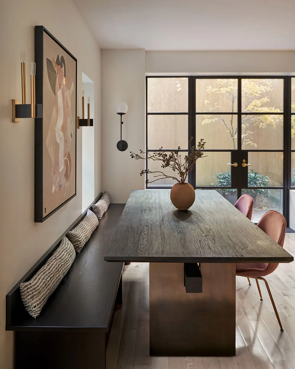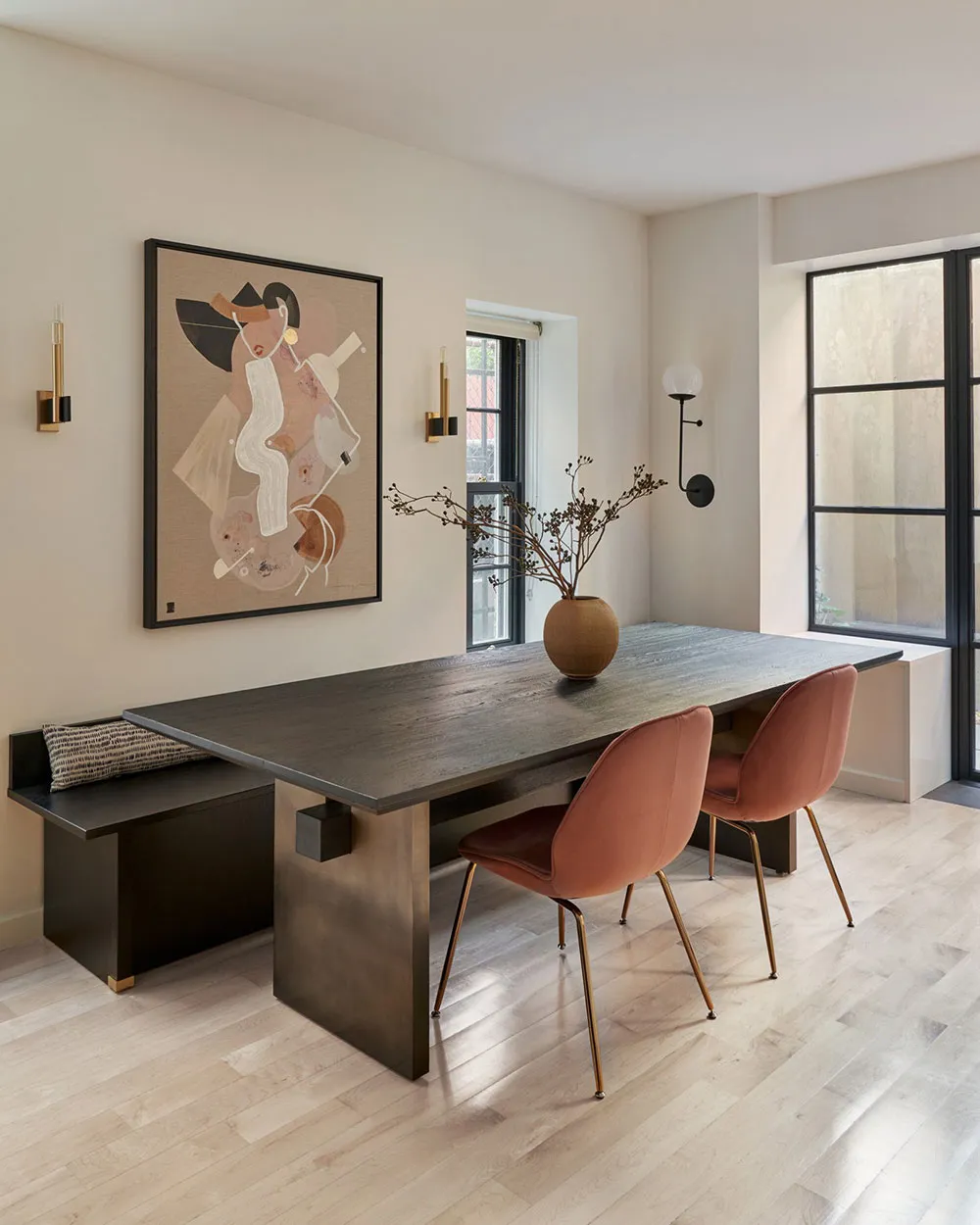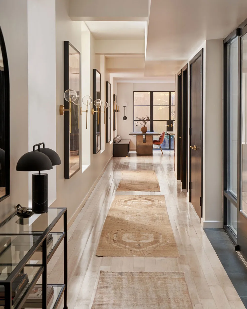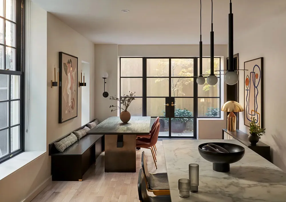 Тёплый современный интерьер в Нью-Йорке с черными деталями и утончённым декором