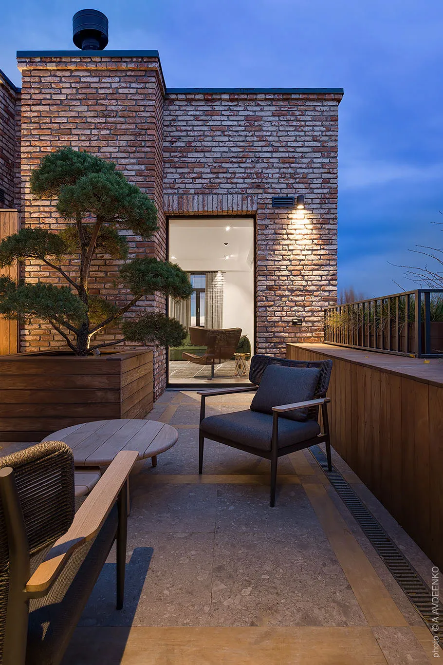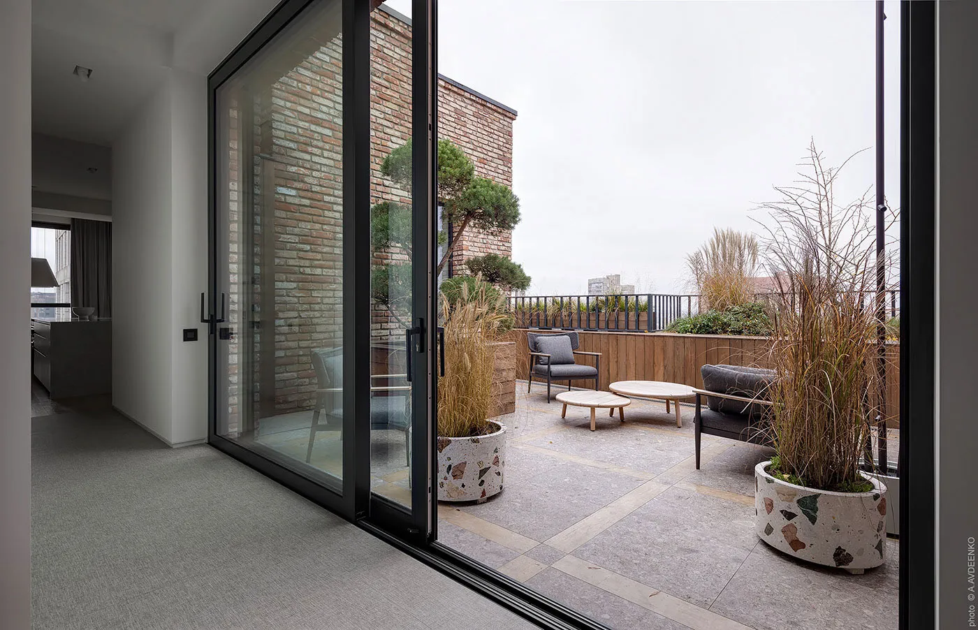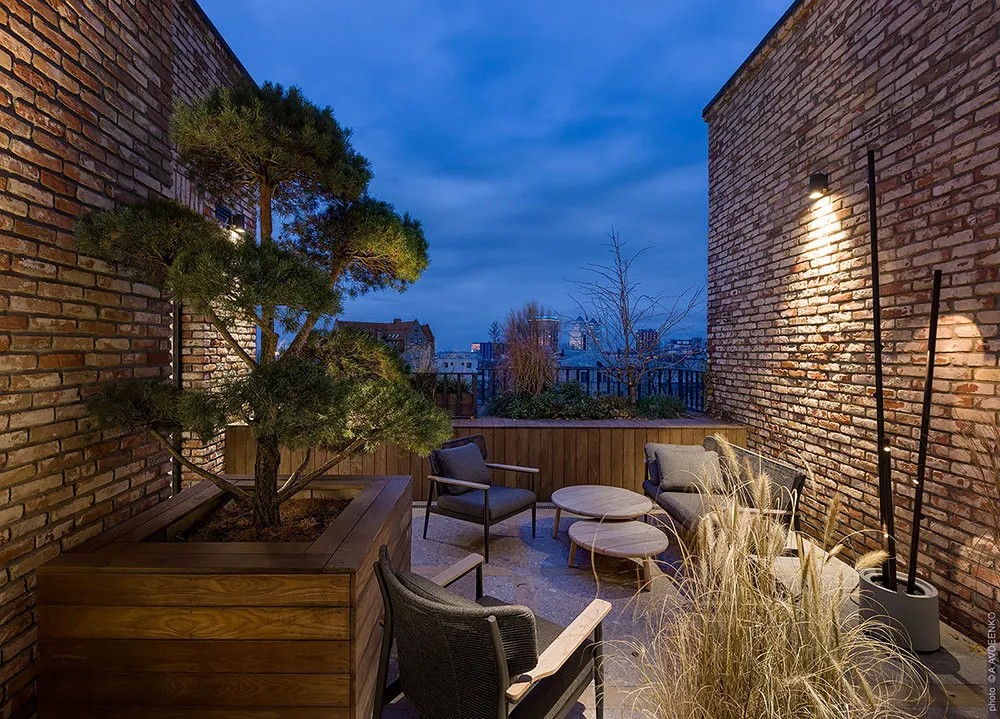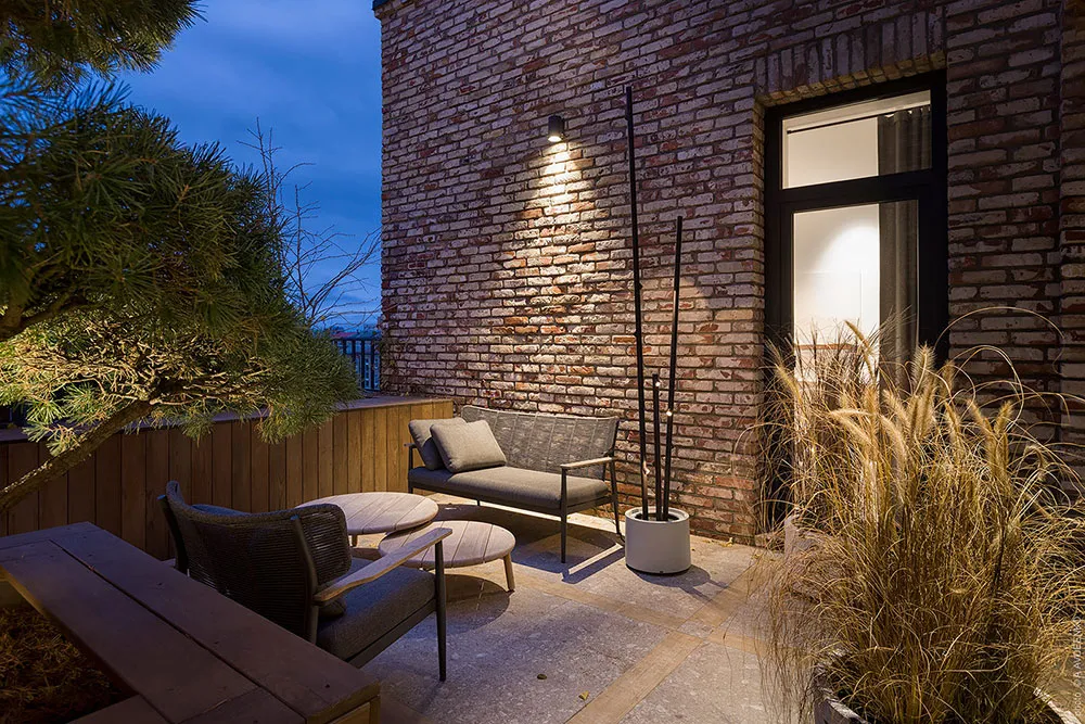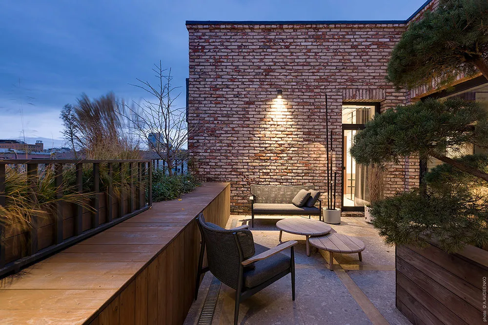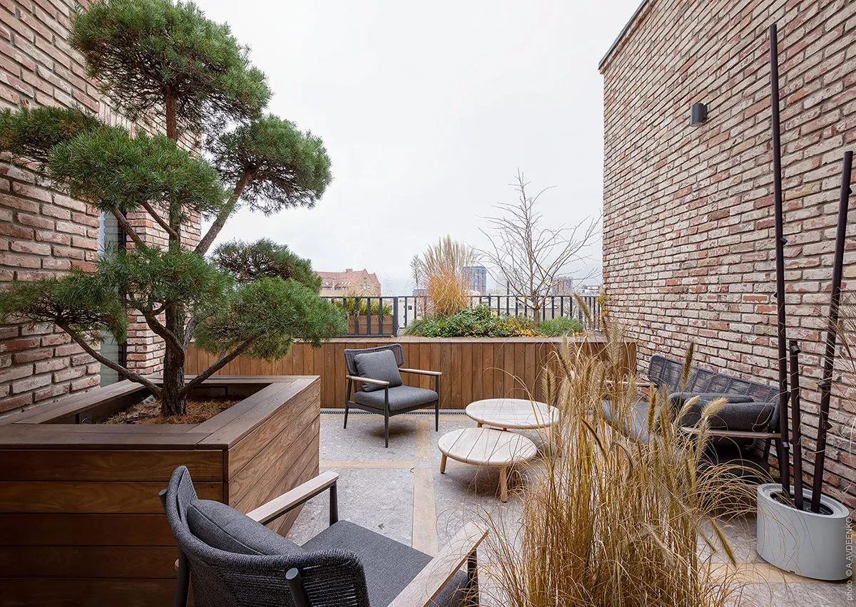 Главная фишка этих современных апартаментов в одном из новых ЖК в Днепре — просторная терраса с видом на город, с двух сторон окруженная кирпичными стенами.