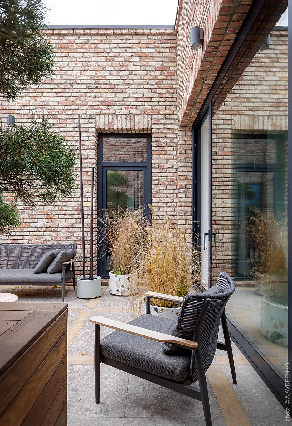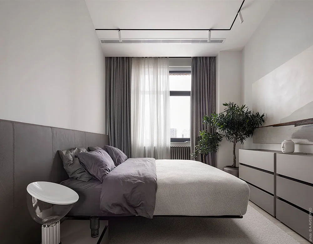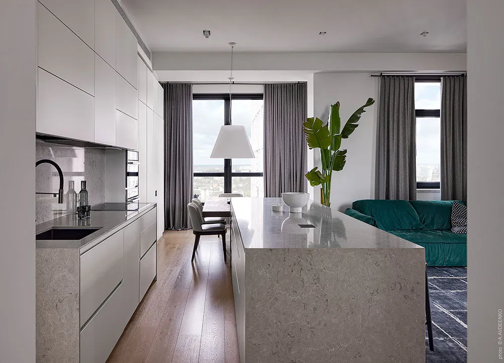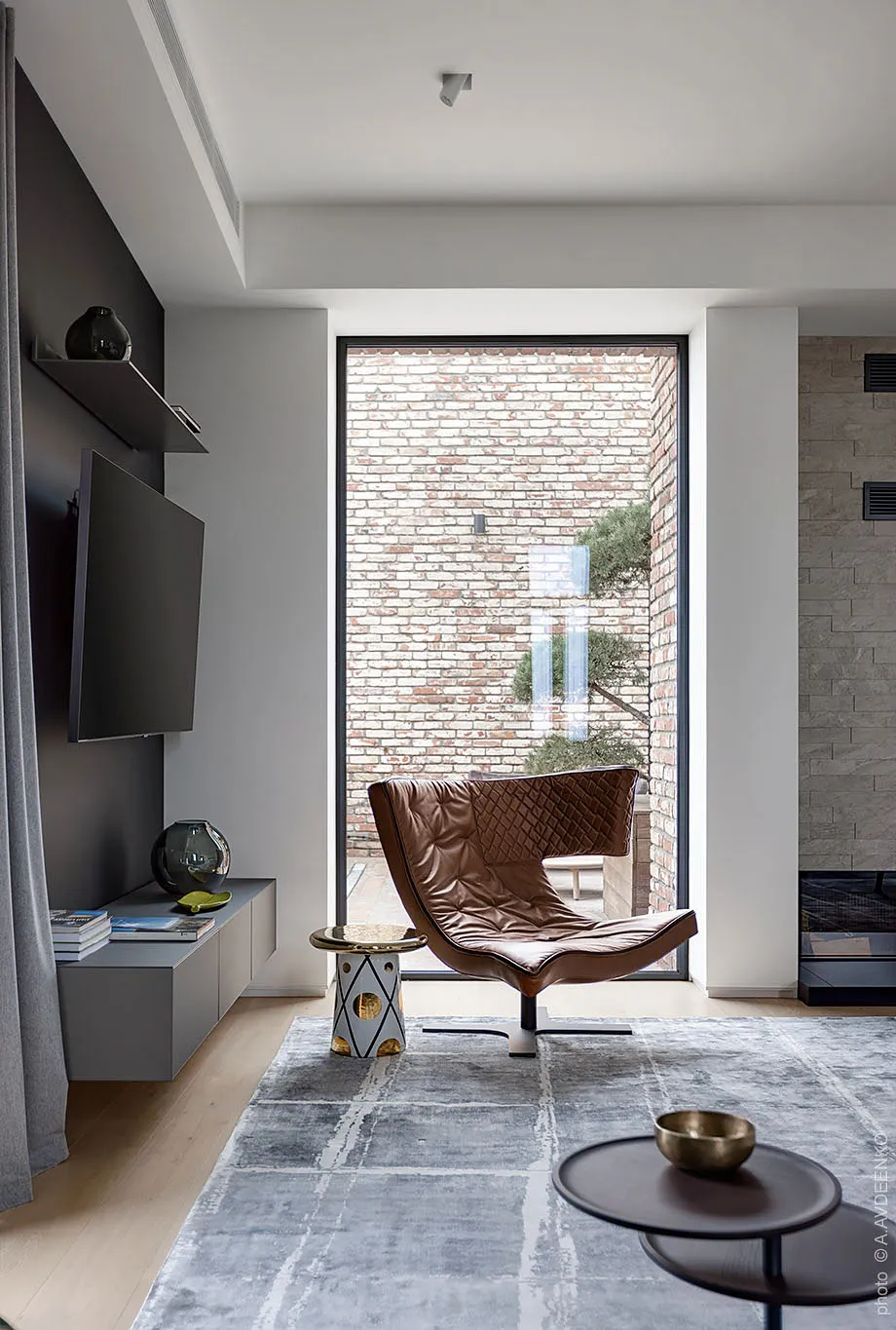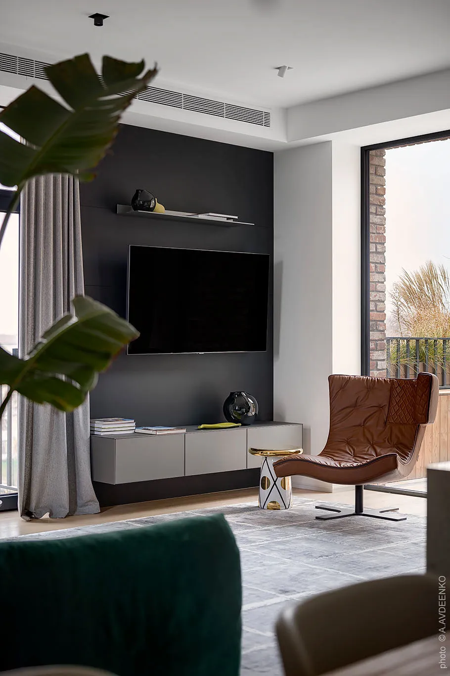 Главная фишка этих современных апартаментов в одном из новых ЖК в Днепре — просторная терраса с видом на город, с двух сторон окруженная кирпичными стенами.