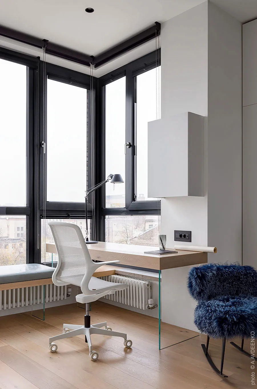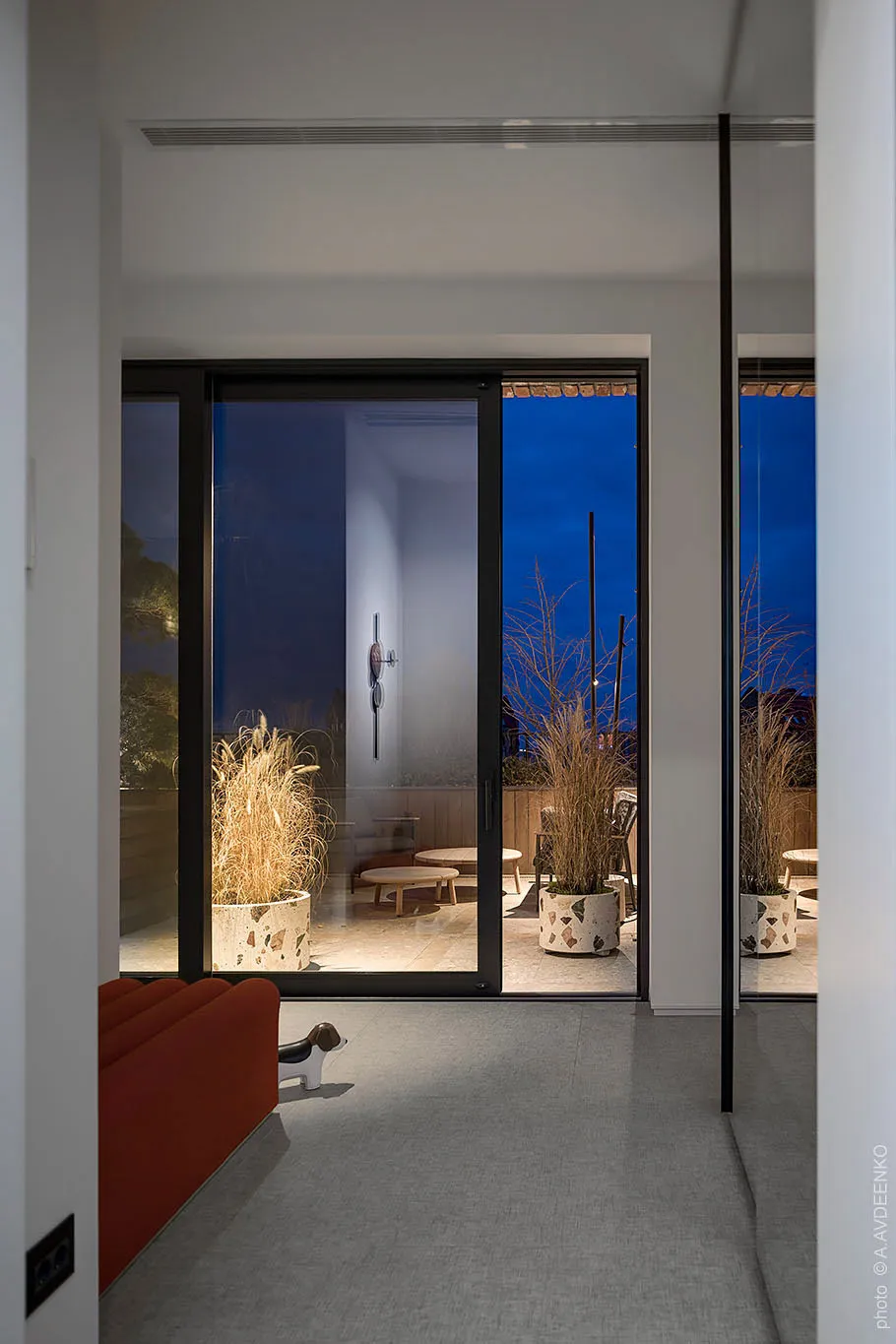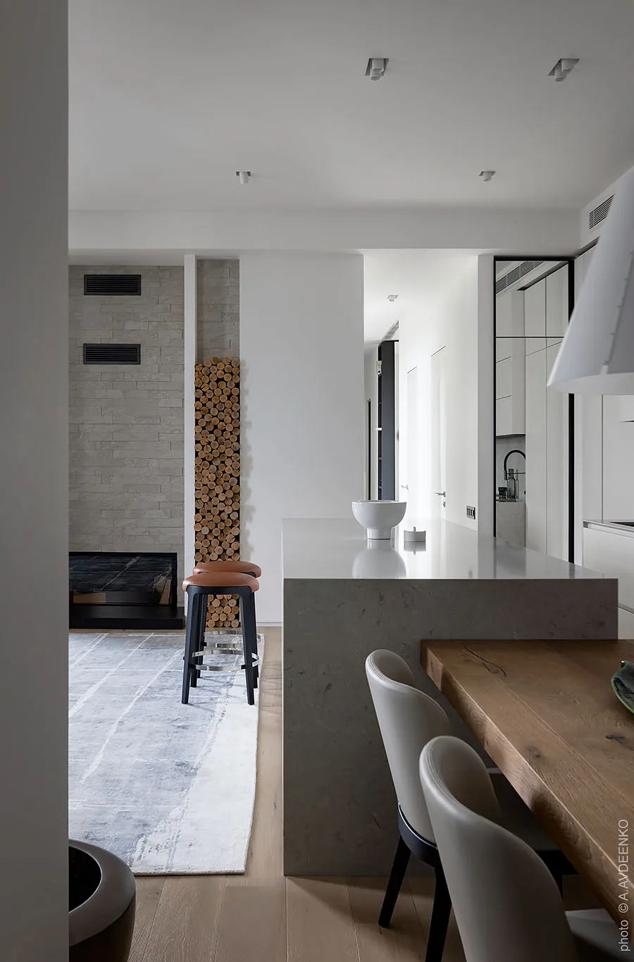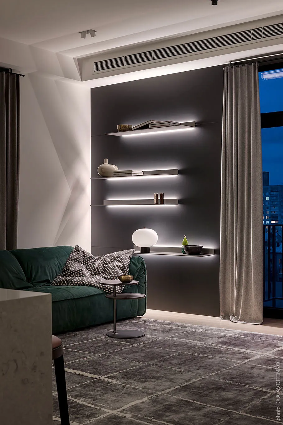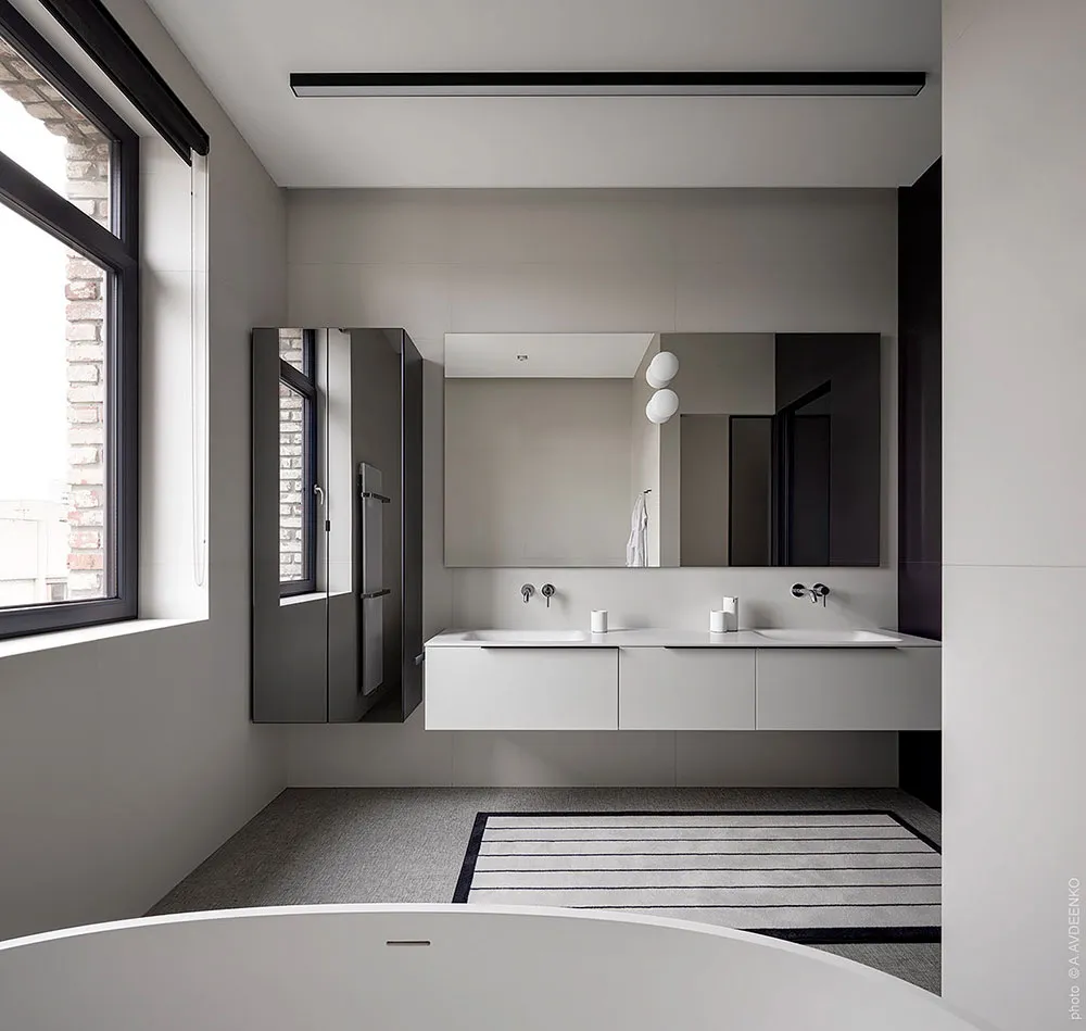 Главная фишка этих современных апартаментов в одном из новых ЖК в Днепре — просторная терраса с видом на город, с двух сторон окруженная кирпичными стенами.