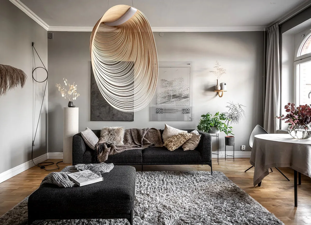 Стильный серый интерьер в Швеции с необычным декором (65 кв. м)