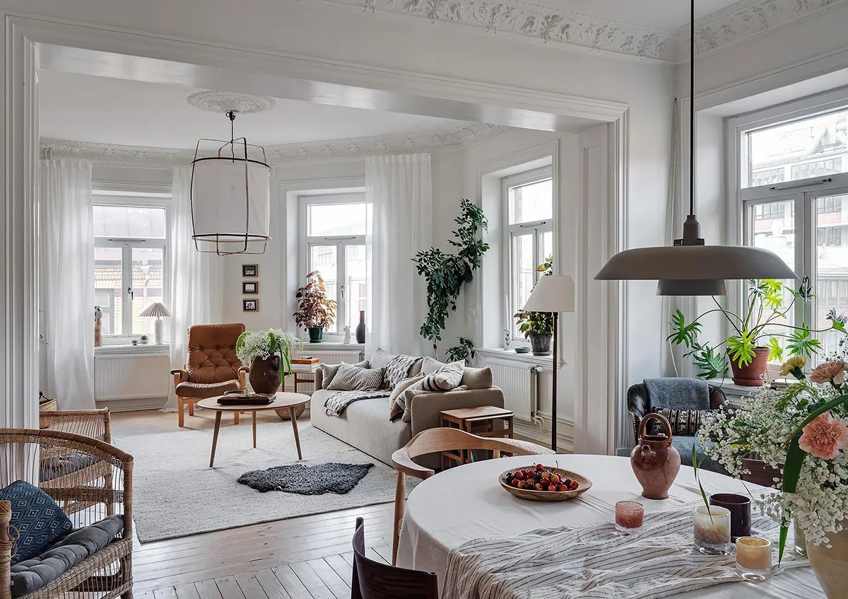 Открытая планировка и живые растения: квартира с лепниной в Гетеборге