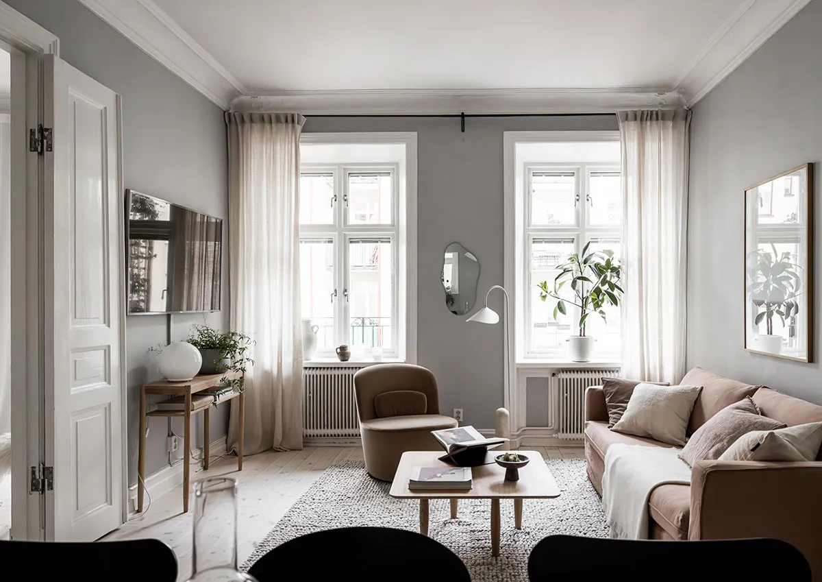 Спокойный скандинавский интерьер с приятной прохладной атмосферой (60 кв. м)