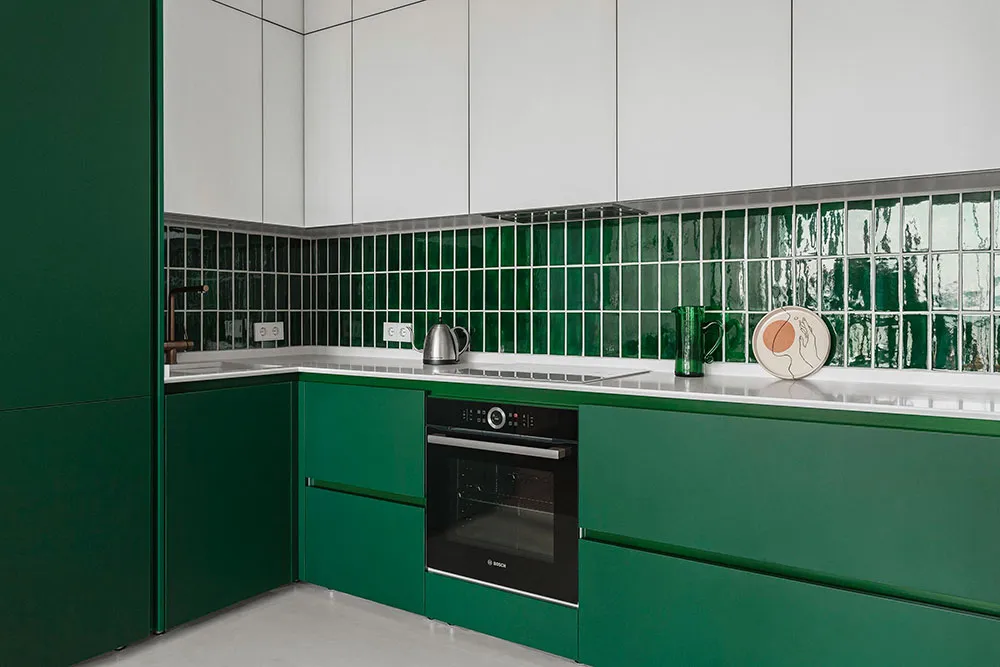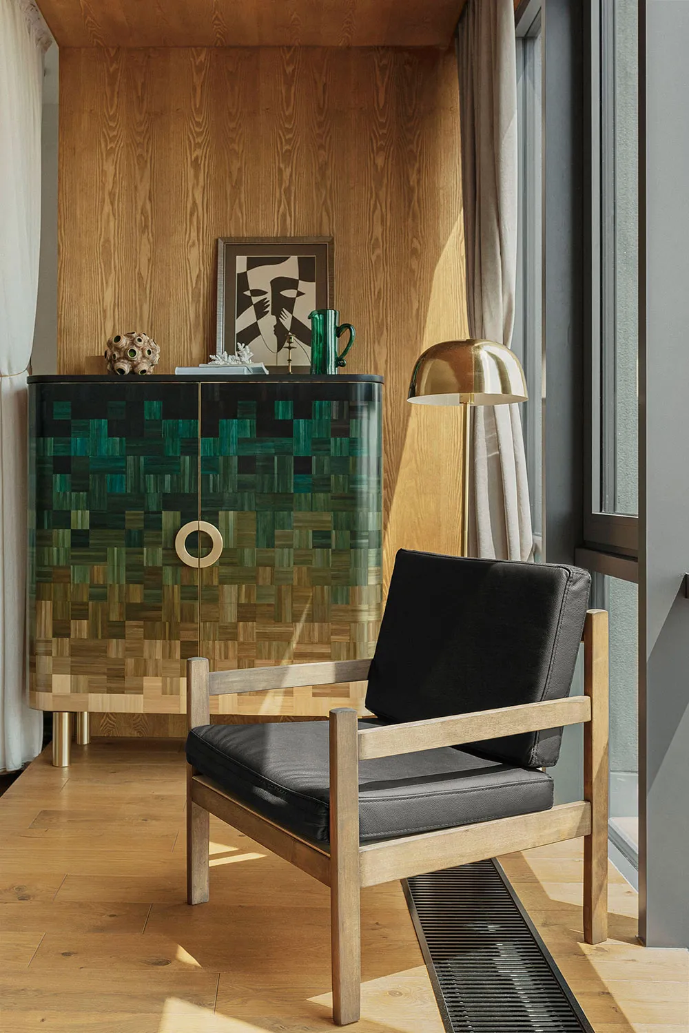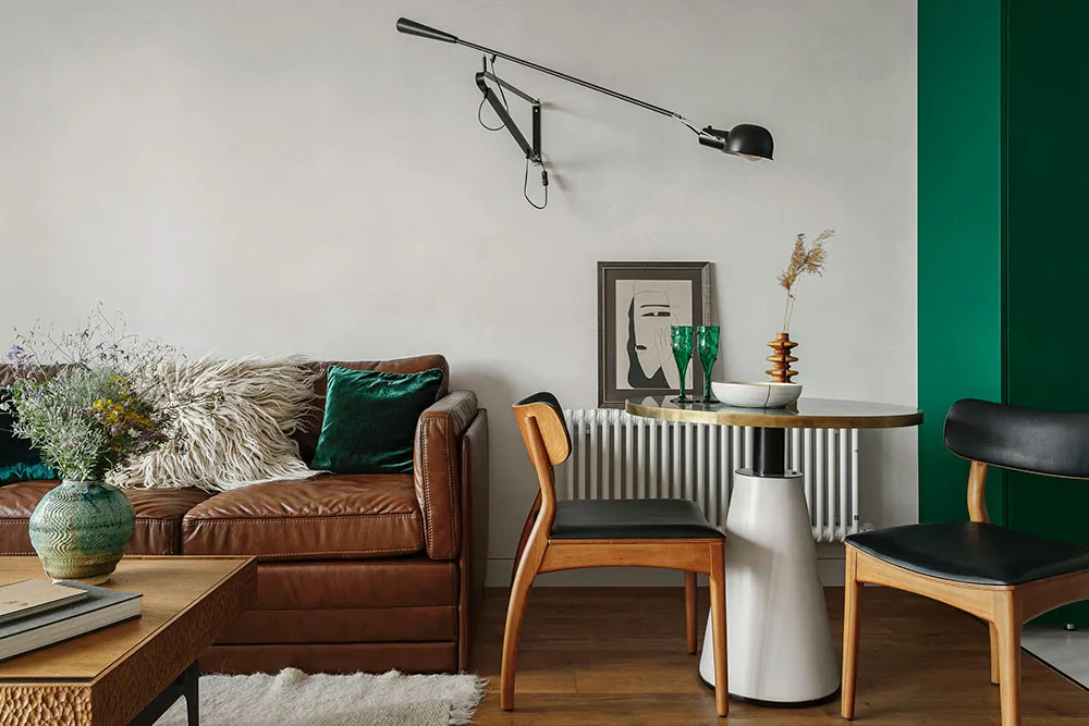 Изумрудные акценты стали основой дизайна этой небольшой квартиры в Одессе — в сочетании с кожаным диваном и натуральным деревом они создали очень интересный и неожиданно стильный микс.