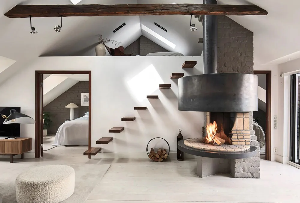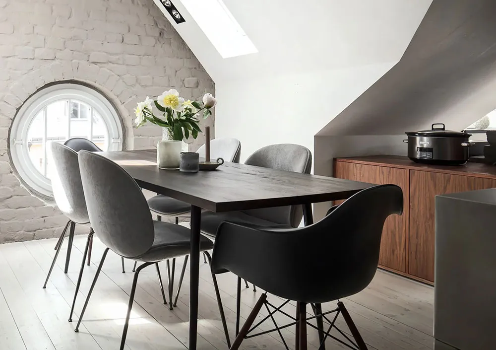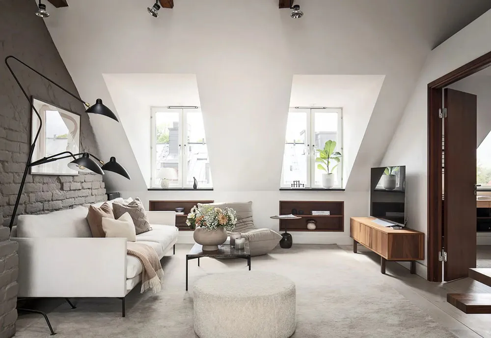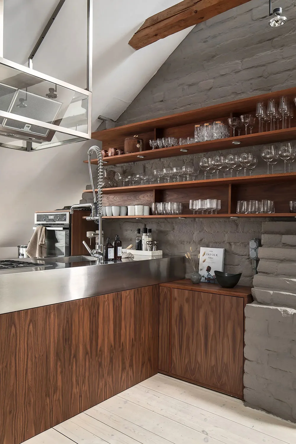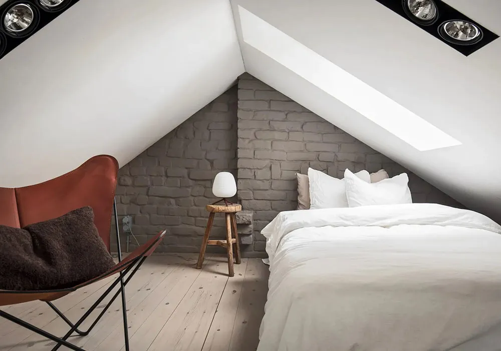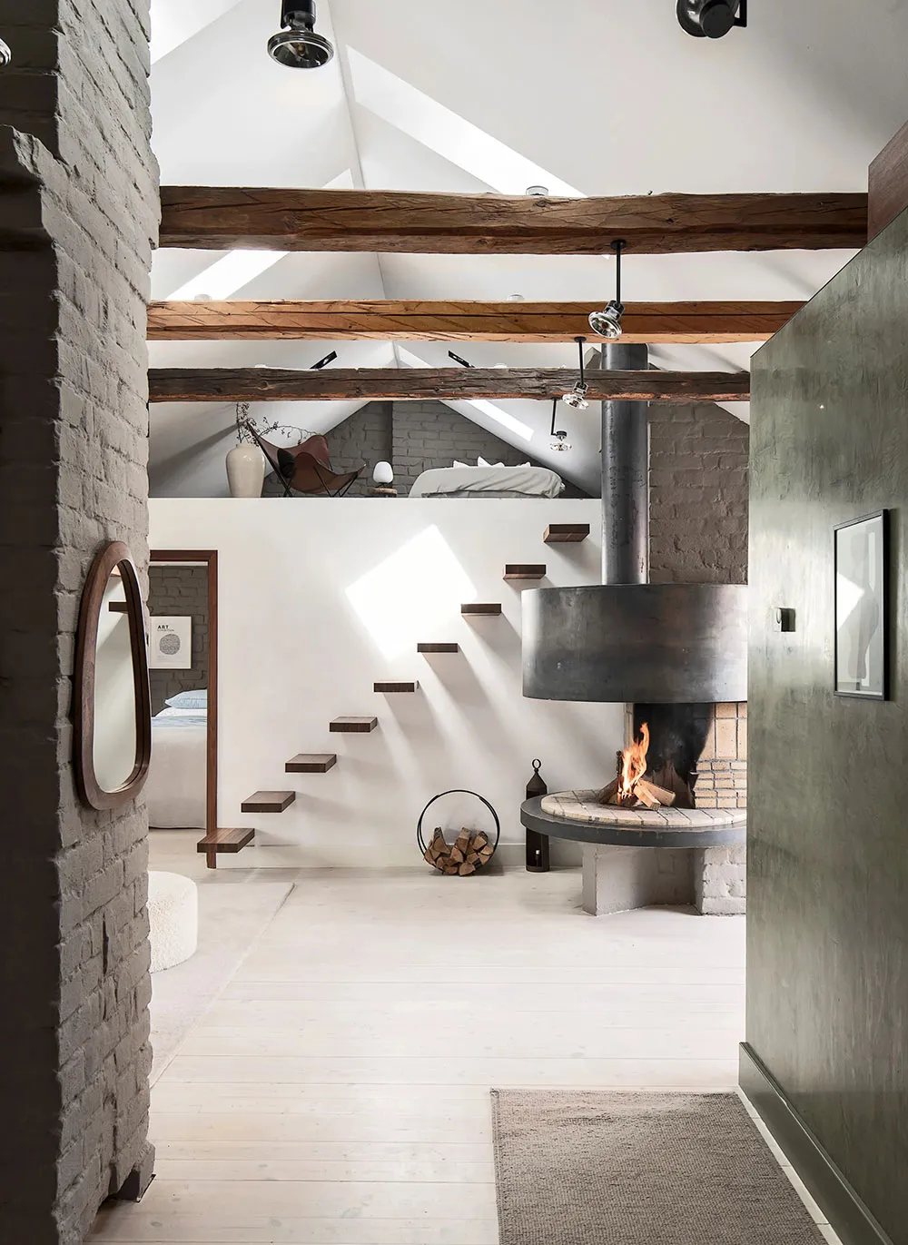 В этой современной мансардной квартире в Стокгольме дизайнеры решили сохранить элементы старинной кирпичной кладки, которой почти 100 лет — сам дом был построен в начале прошлого века.
