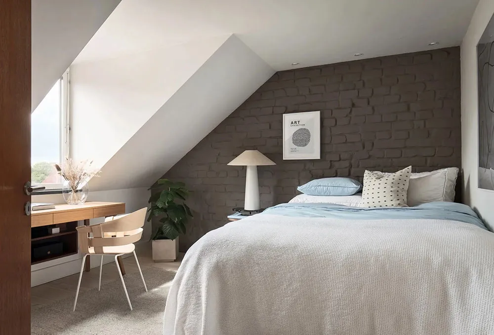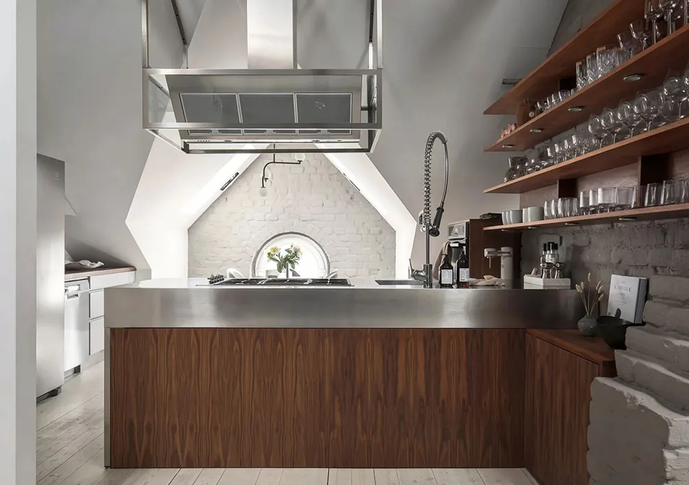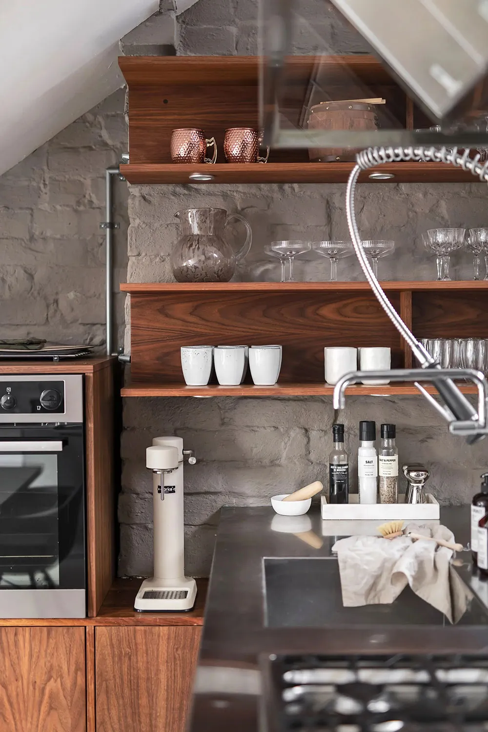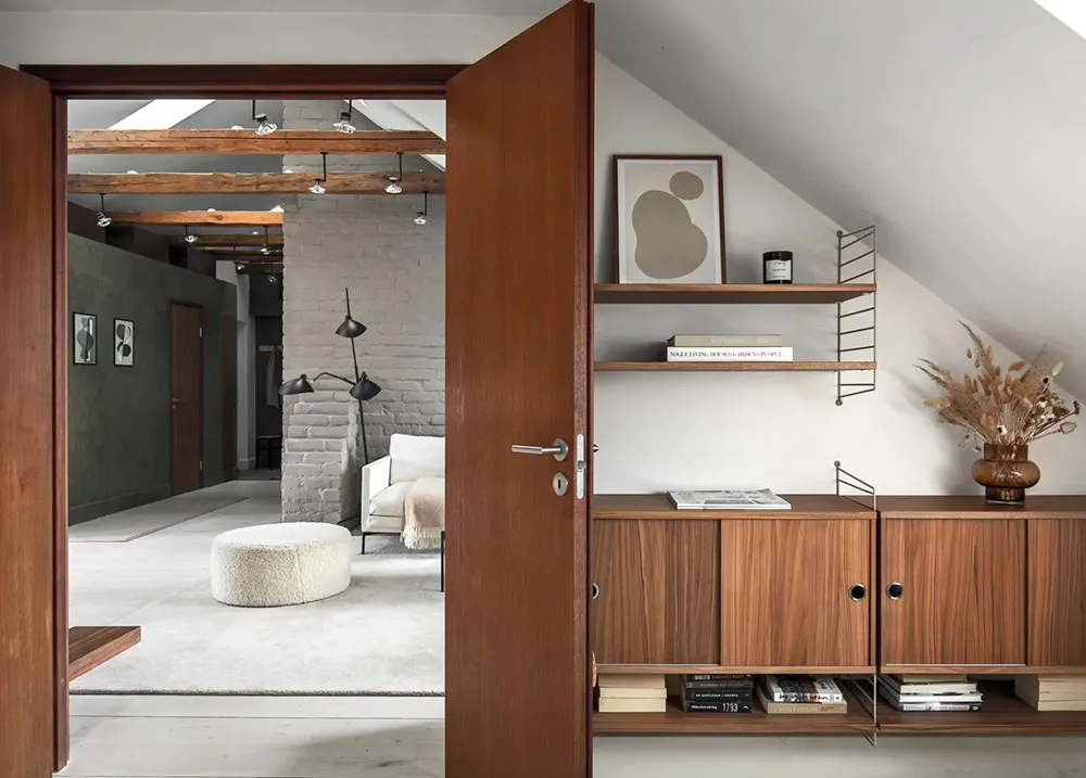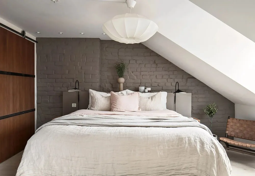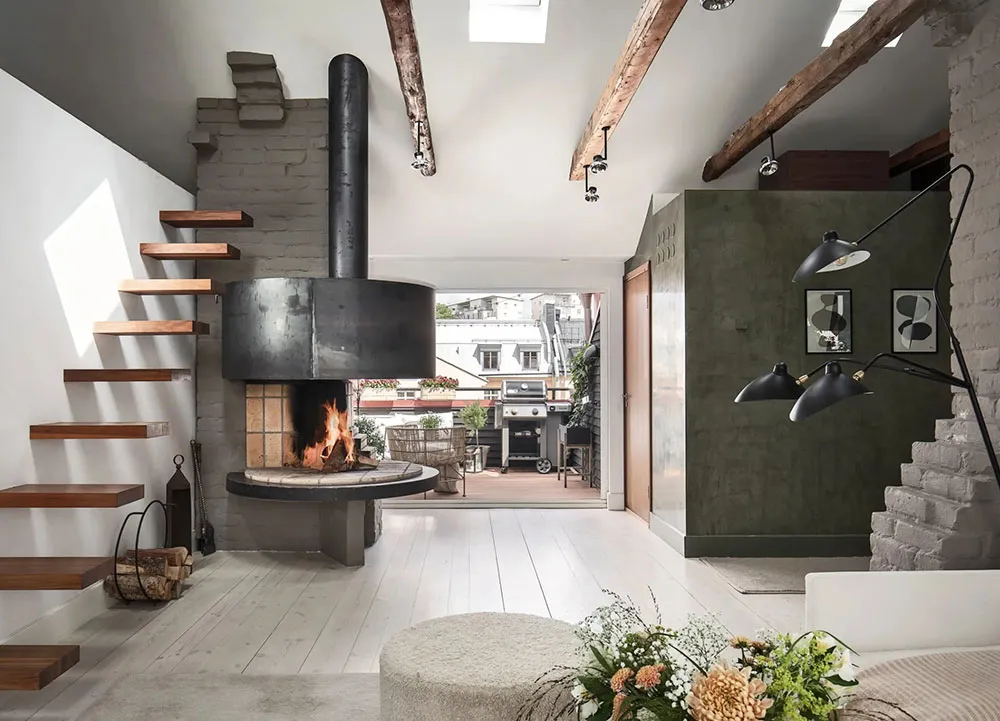 В этой современной мансардной квартире в Стокгольме дизайнеры решили сохранить элементы старинной кирпичной кладки, которой почти 100 лет — сам дом был построен в начале прошлого века.