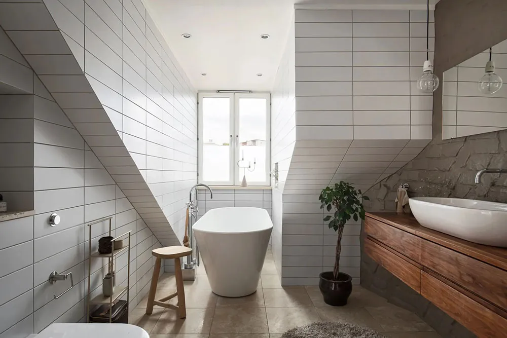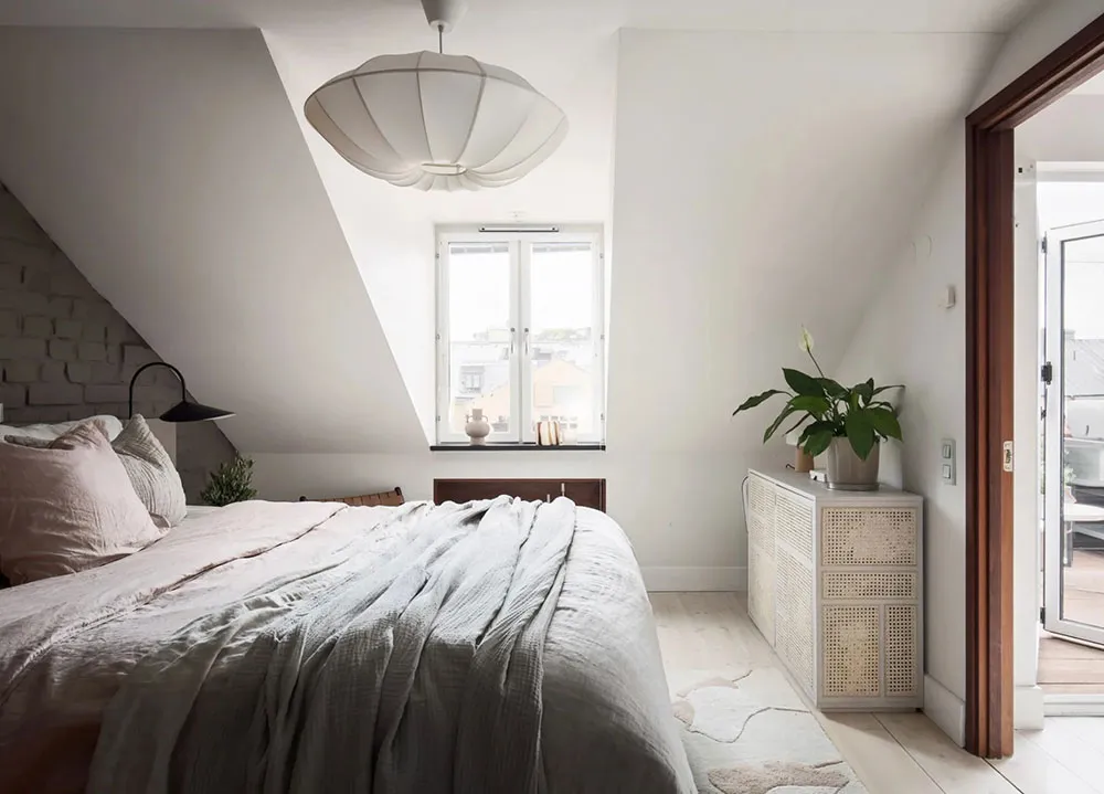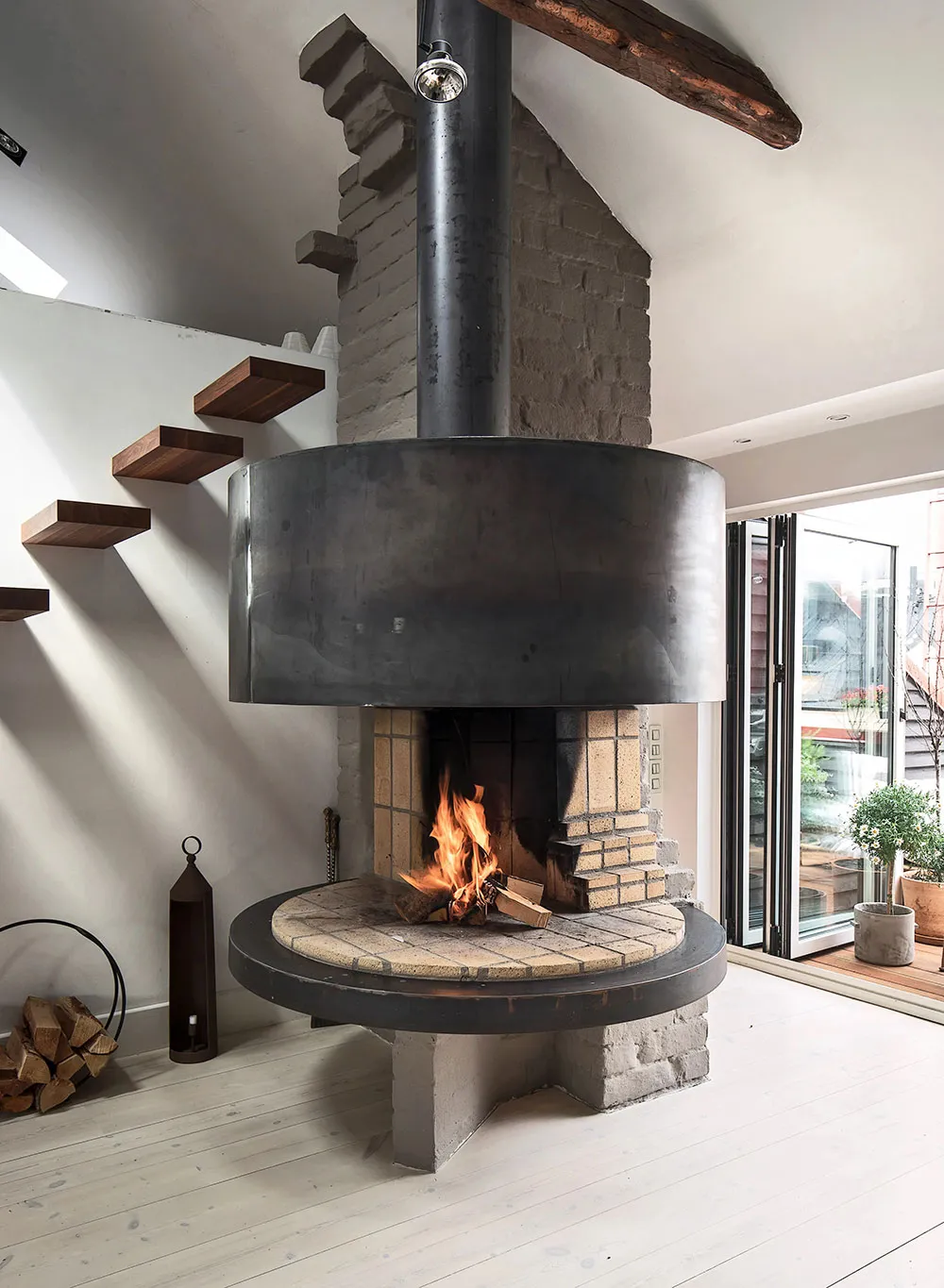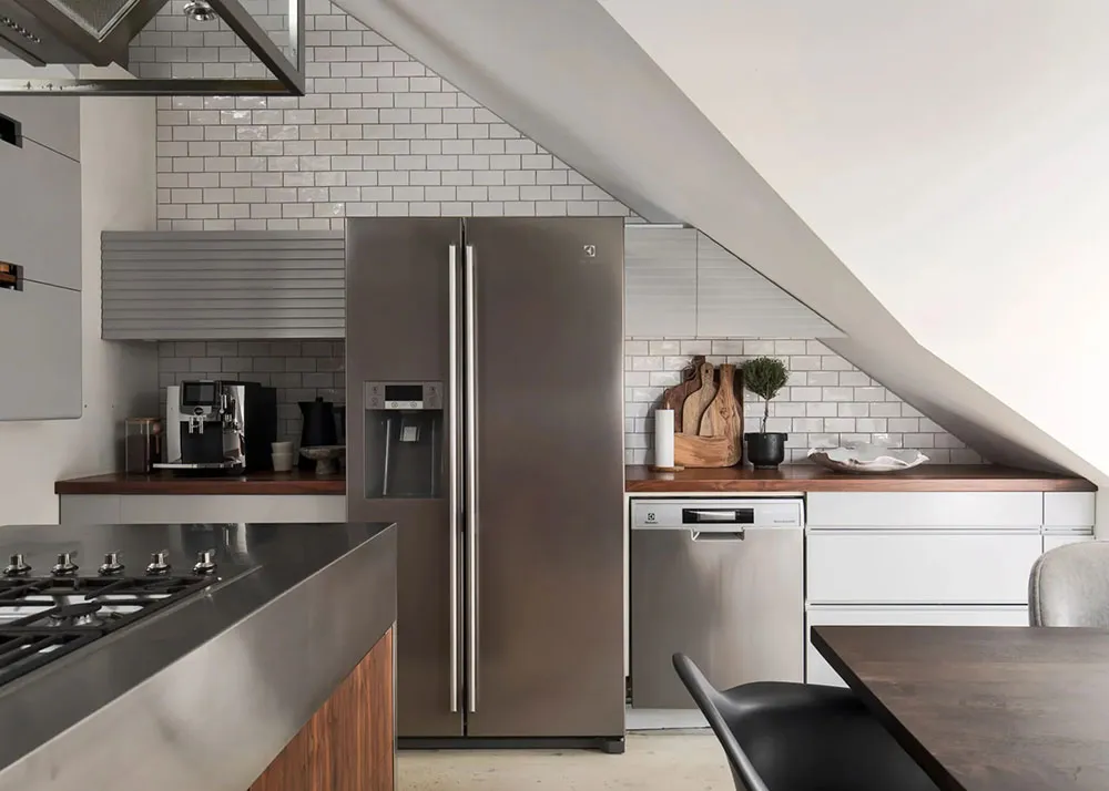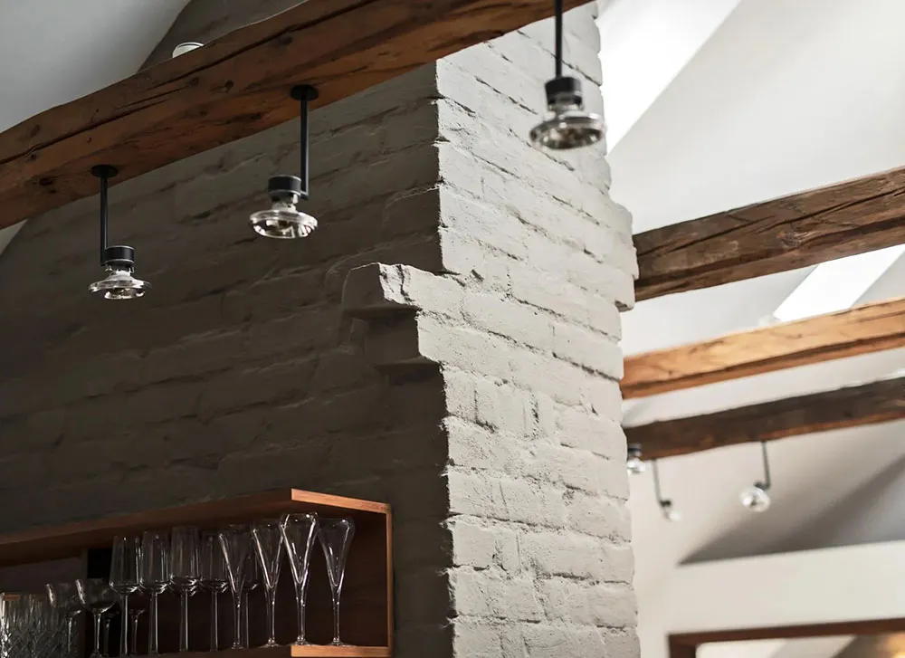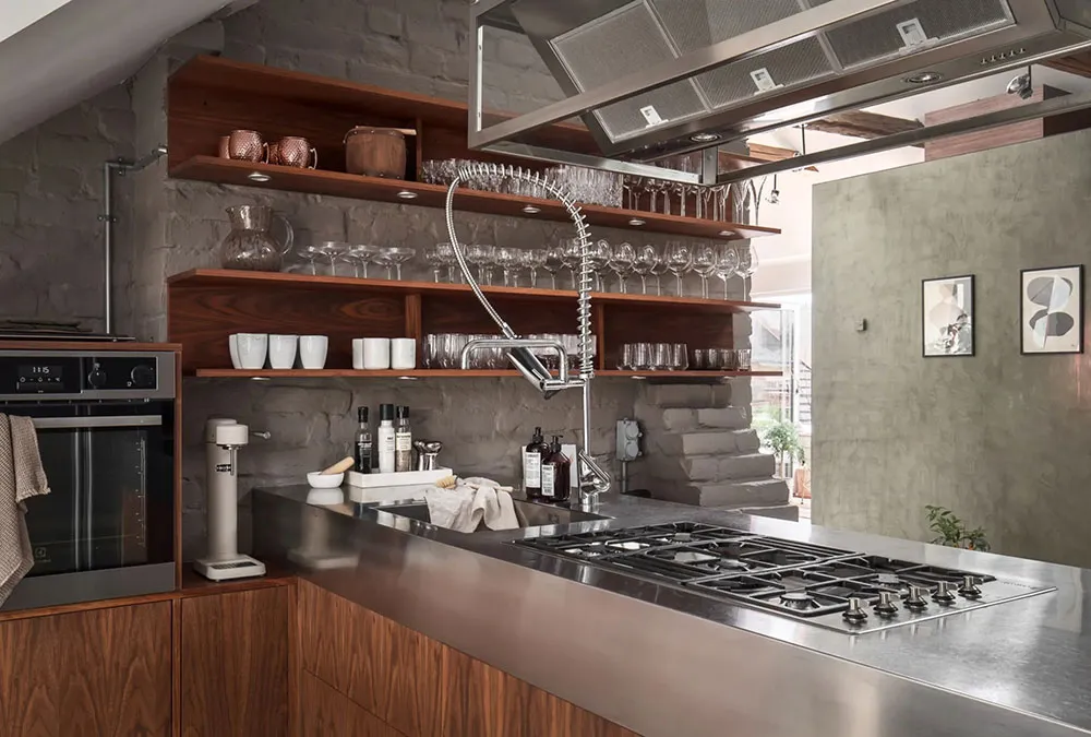 В этой современной мансардной квартире в Стокгольме дизайнеры решили сохранить элементы старинной кирпичной кладки, которой почти 100 лет — сам дом был построен в начале прошлого века.