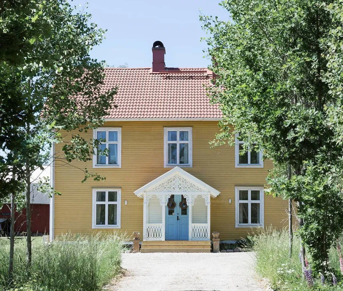 Красивый жёлтый коттедж 19-века с голубой дверью в Швеции